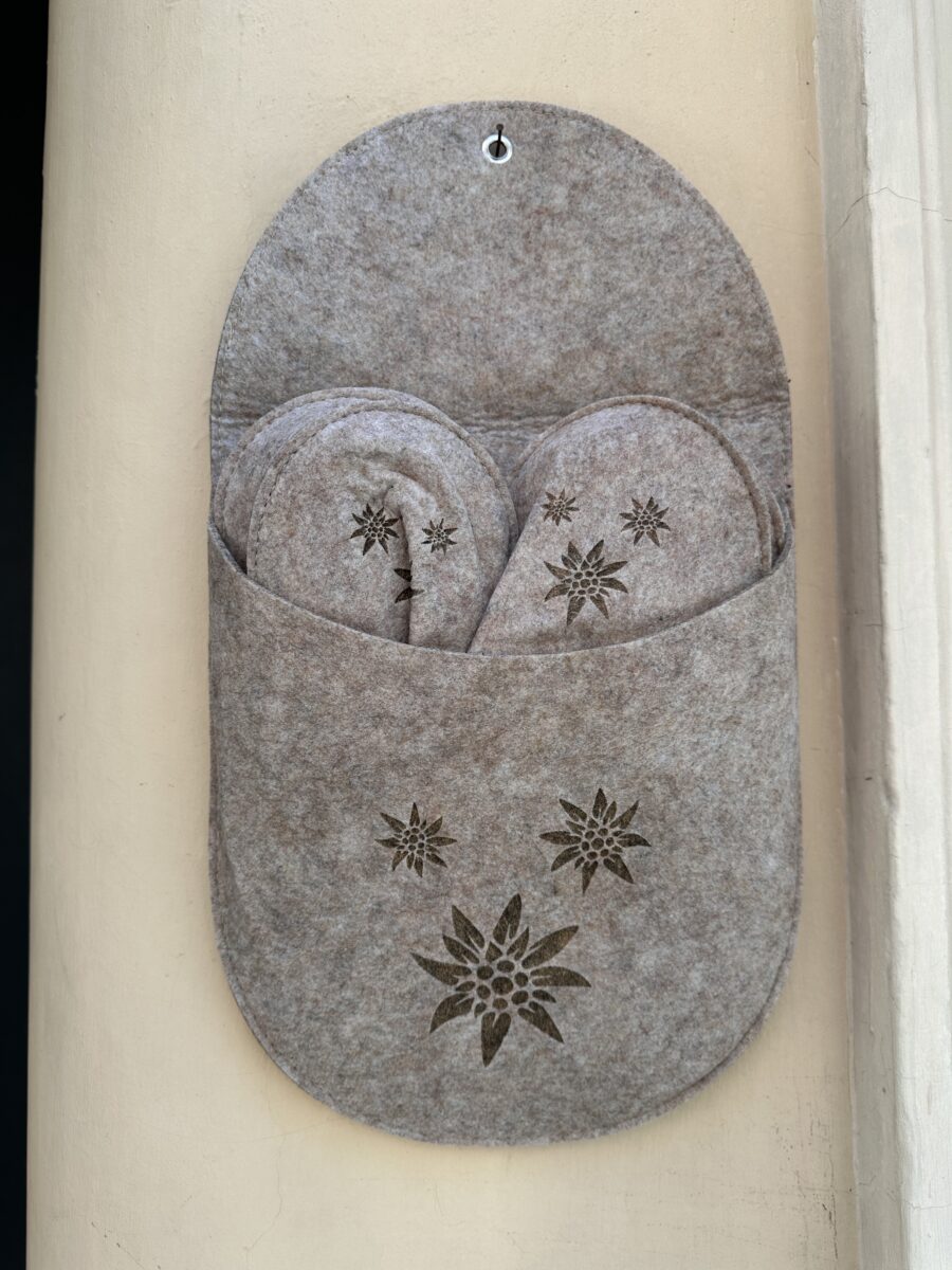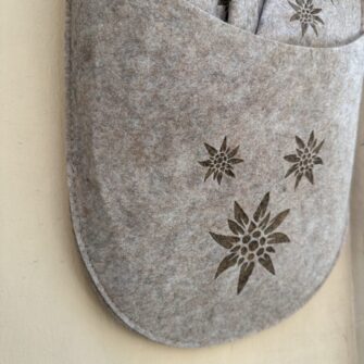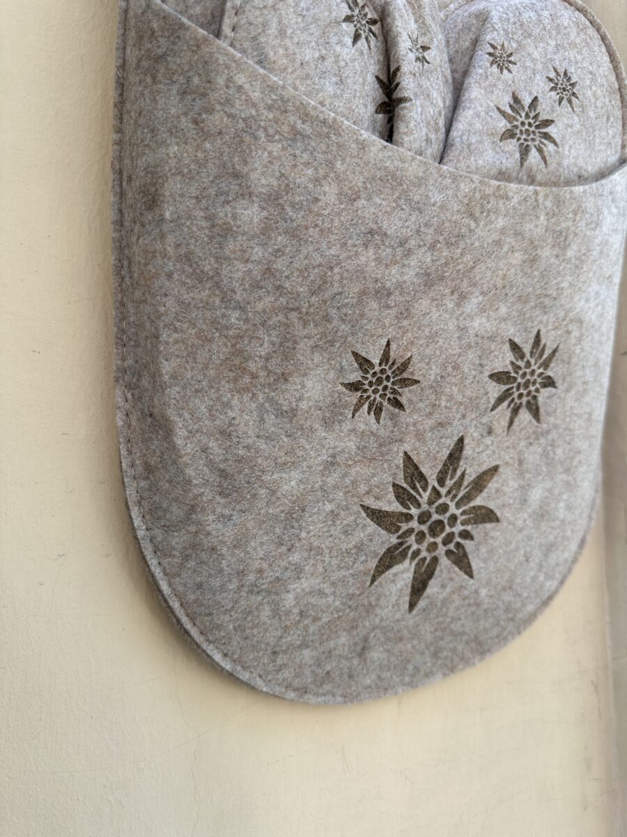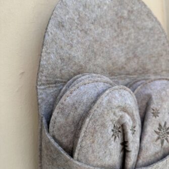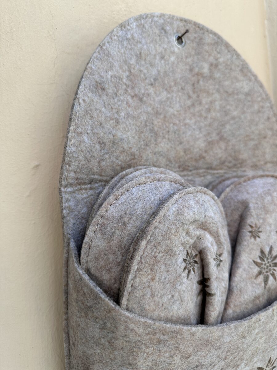 Un Set Pantofole in Feltro Tortora decorate che rappresenta un’idea regalo davvero originale e affascinante, ideale per accogliere ospiti nella propria casa o per arricchire l’atmosfera accogliente della casa delle vacanze. Queste pantofoline, realizzate in morbido feltro, non solo offrono comfort e calore, ma le loro decorazioni aggiungono un tocco di eleganza e personalità che non passa inosservato. Immagina di entrare in una casa e trovare un set di pantofoline elegante e ben organizzato, pronto ad accoglierti con il suo aspetto invitante. La particolarità di questo set risiede nel modo in cui viene presentato: una grande ciabatta che funge da elegante contenitore. Questo contenitore, oltre a mantenere le pantofoline ordinate e a portata di mano, può essere appeso come una decorazione unica e accattivante, arricchendo qualsiasi ambiente con il suo design innovativo.