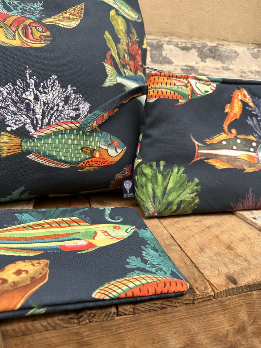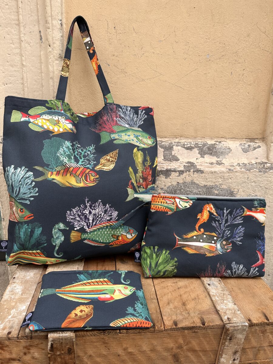 La Collezione Pesci Capri prende ispirazione dal Mediterraneo e dalle atmosfere vivaci dell’isola azzurra. Con i nostri tessuti esclusivi abbiamo creato un set tote bag pochette beauty case Pesci Capri, allegro e pratico, pensato per chi ama accessori che raccontano il mare. 🐟