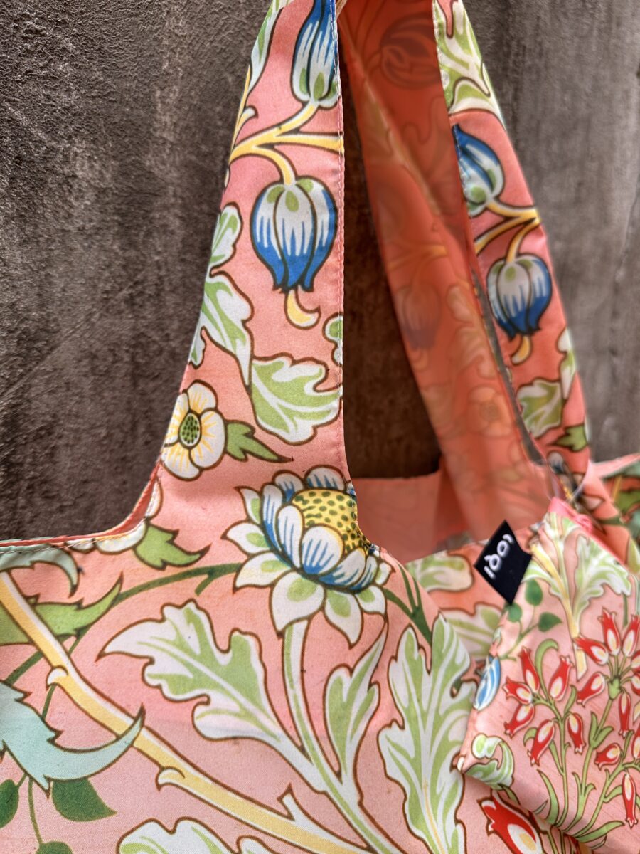 La shopper pieghevole Loqi “Giacinti – William Morris” è un piccolo gioiello di design ispirato al celebre artista e decoratore britannico, padre del movimento Arts & Crafts. Il disegno floreale ricco, armonioso e intramontabile rende questa borsa un accessorio che cattura subito l’attenzione. I toni pesca e corallo della base si intrecciano con foglie verde salvia, tocchi di rosso e blu intensi, creando un pattern elegante e senza tempo. Perfetto per chi ama l’arte applicata agli oggetti di uso quotidiano.