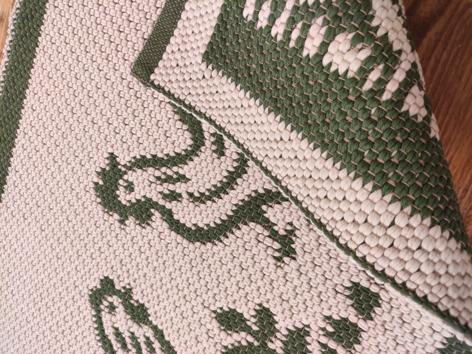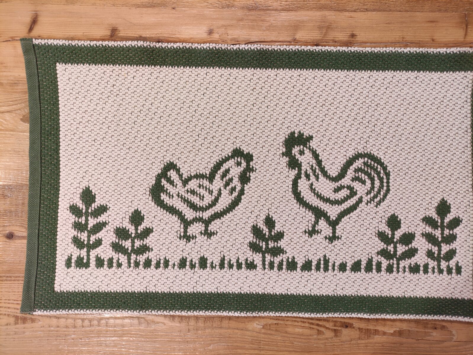 La larghezza del Tappeto Galline Verde è determinata dal telaio ed è pari a 60 cm, una misura pensata per adattarsi con facilità a diversi spazi della casa. La lunghezza, invece, può variare su richiesta, arrivando fino a 3 metri. Questo permette di utilizzare il tappeto in corridoi, ingressi, cucine o ai piedi di un letto, adattandolo alle esigenze specifiche di ogni ambiente.