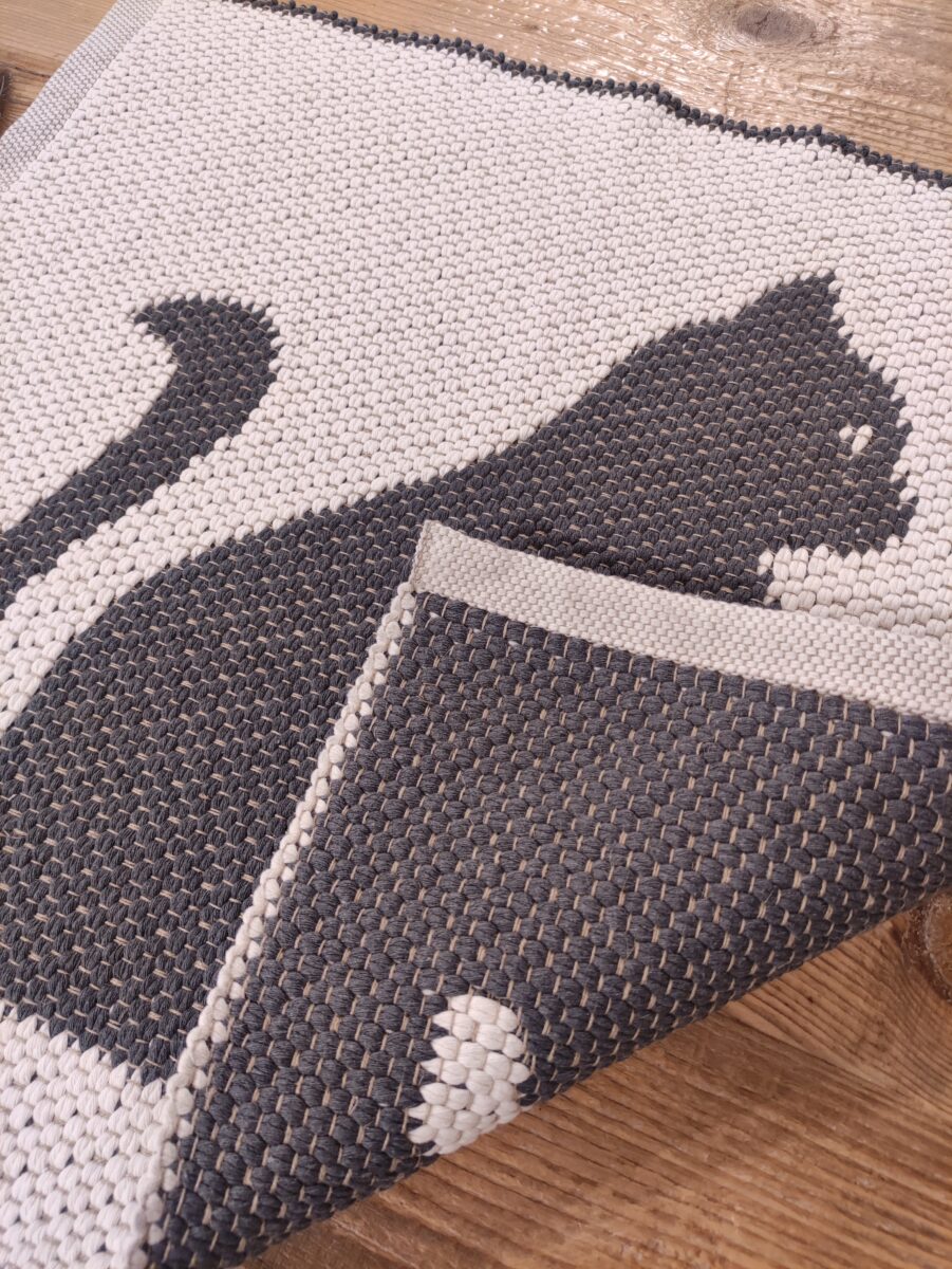 Il Tappeto Gatto Antracite Avorio è realizzato a telaio manuale con un elegante motivo ispirato ai nostri amici domestici. La lavorazione double face positivo/negativo in cotone e lino crea un intreccio resistente, decorativo e lavabile, ideale per dare carattere a cucine, ingressi e corridoi.