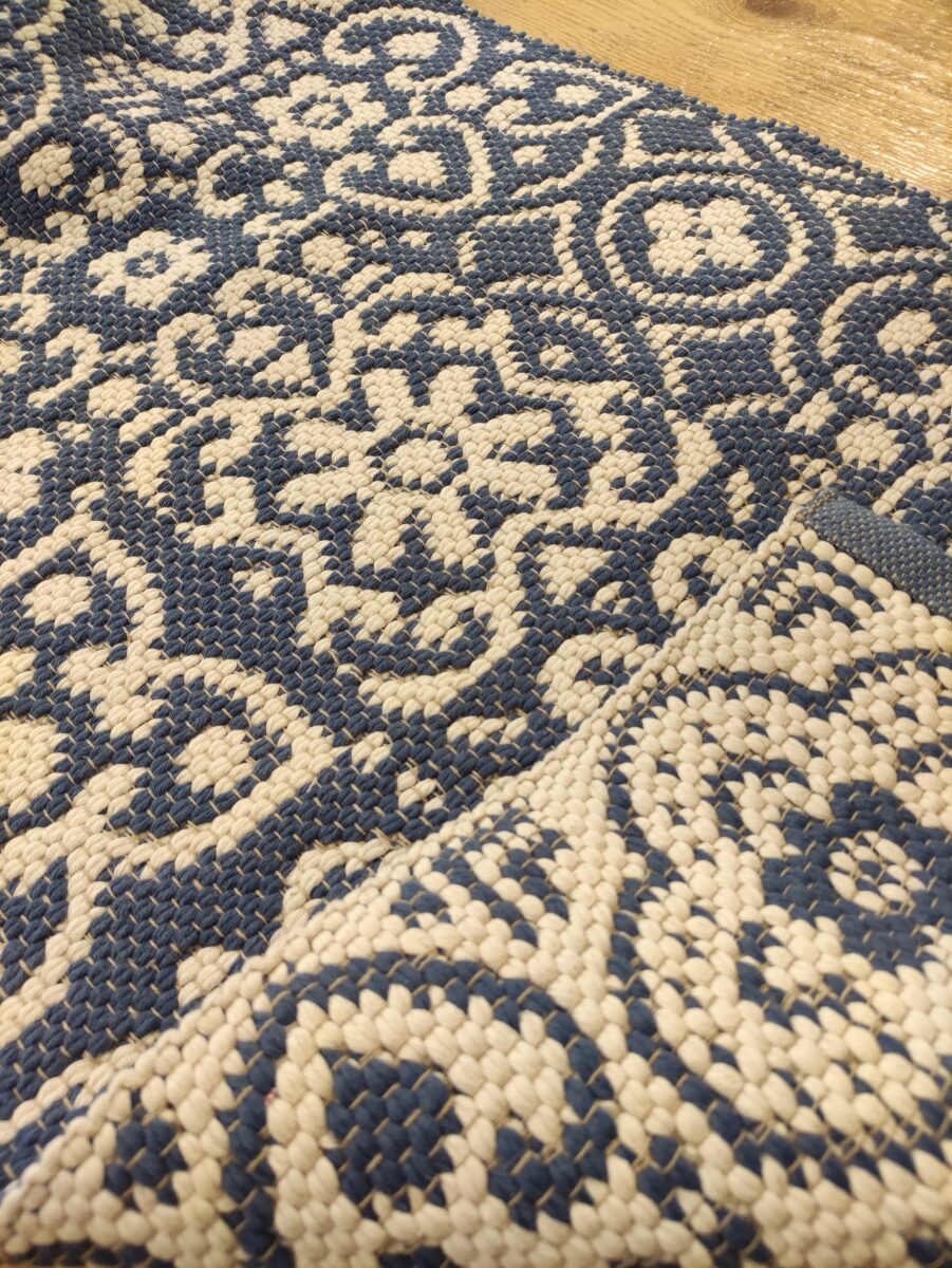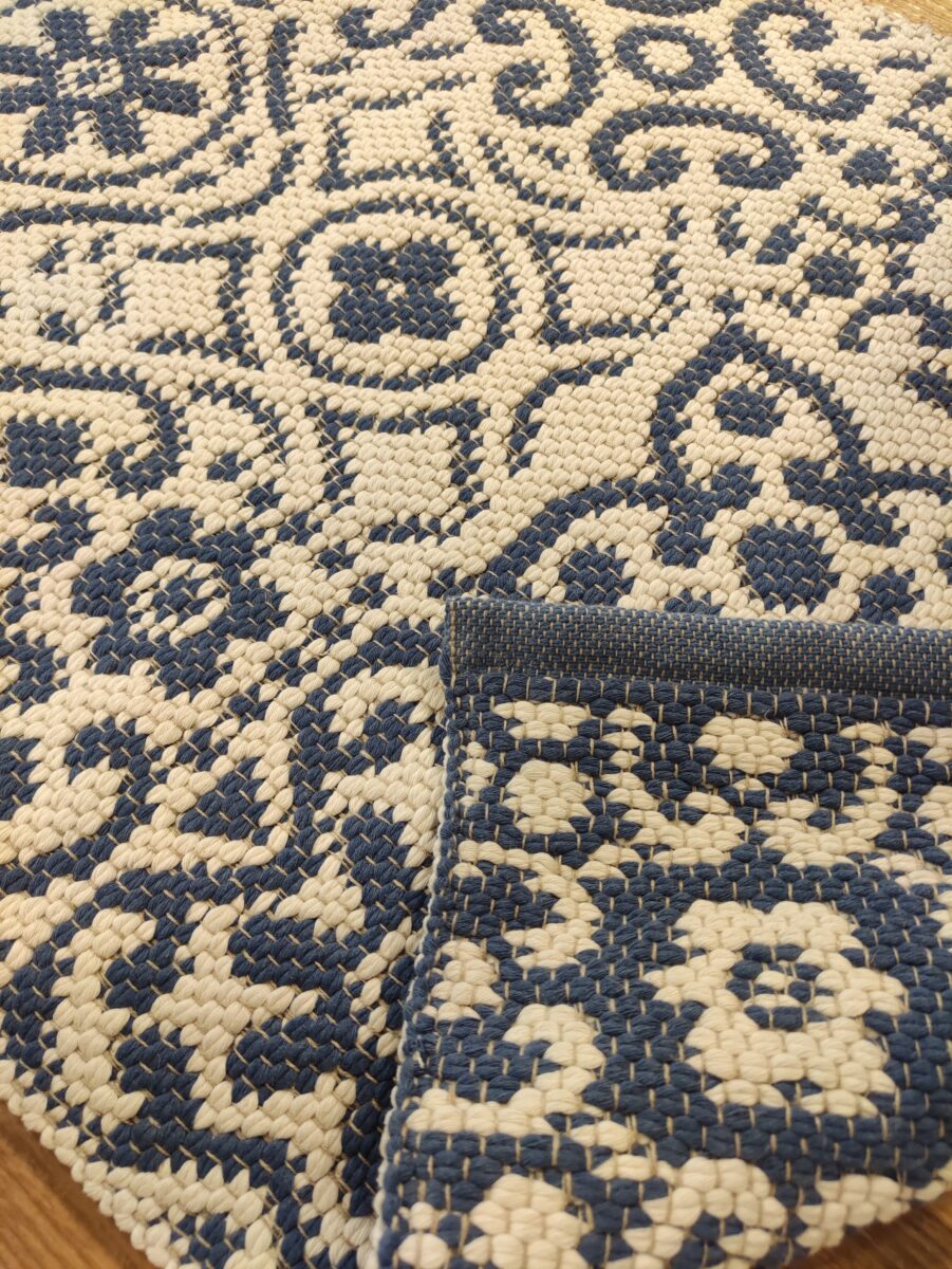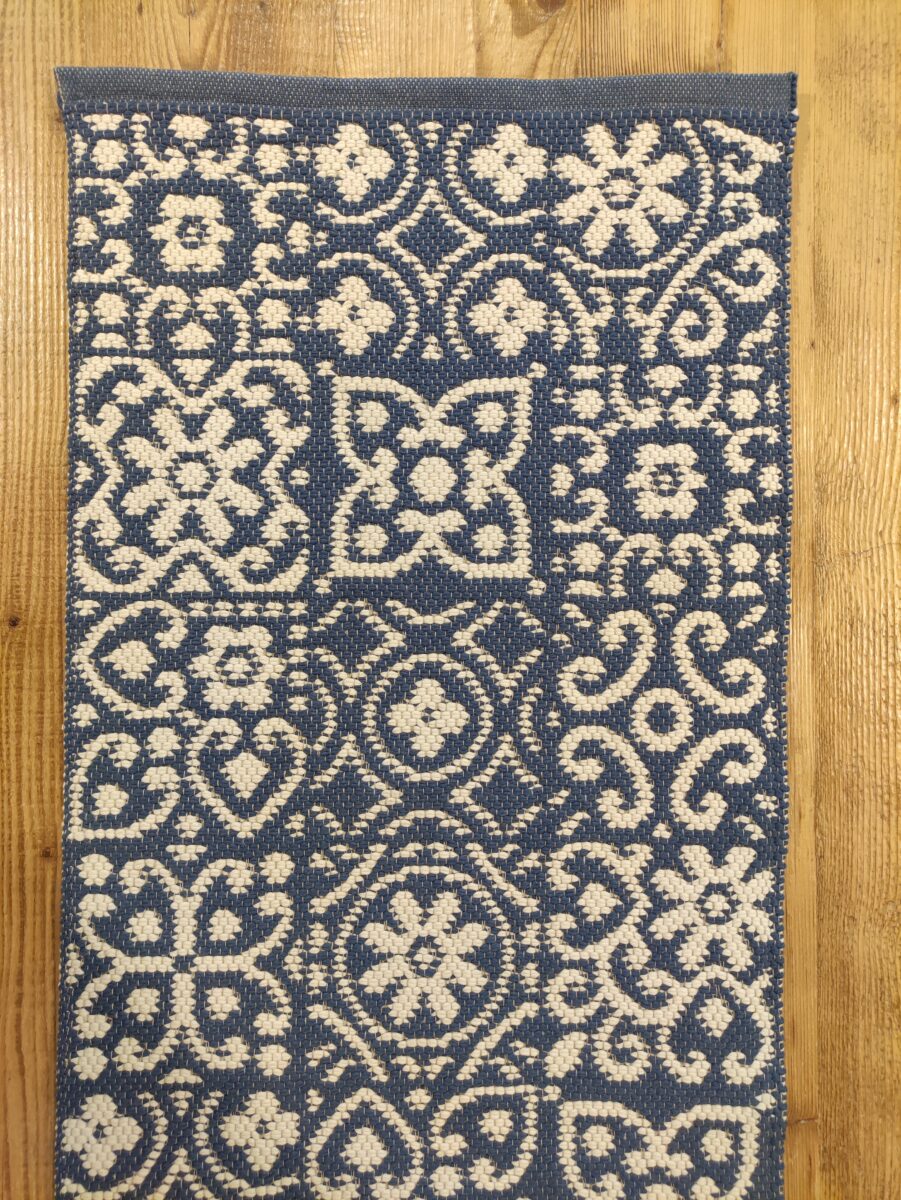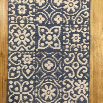 Tappeto Maioliche Blu-Avorio – Il tappeto maioliche nasce dalla tradizione dei tessitori italiani ed è realizzato a telaio manuale con una cura che rende ogni pezzo unico. L’ispirazione arriva dalle antiche ceramiche mediterranee, da cui deriva il caratteristico motivo geometrico-floreale che richiama il ritmo delle maioliche dipinte a mano. Questo disegno, elegante e intramontabile, prende forma attraverso una tessitura double face positivo/negativo che alterna due colori, offrendo di fatto due tappeti in uno. Basta girarlo per ottenere un effetto completamente diverso. Da un lato prevale il fondo colorato con il disegno in avorio, dall’altro il contrario, creando un equilibrio armonioso che si adatta sia a interni moderni sia a spazi più classici.