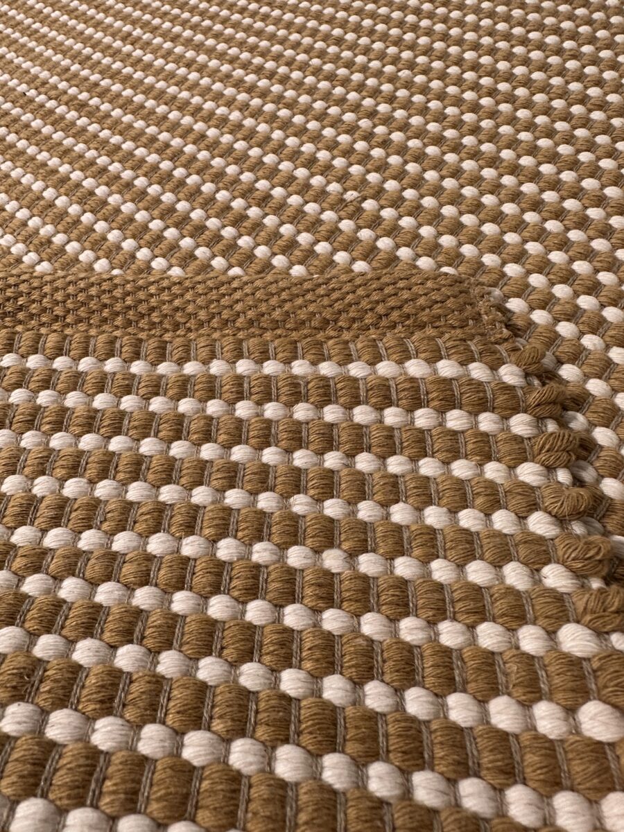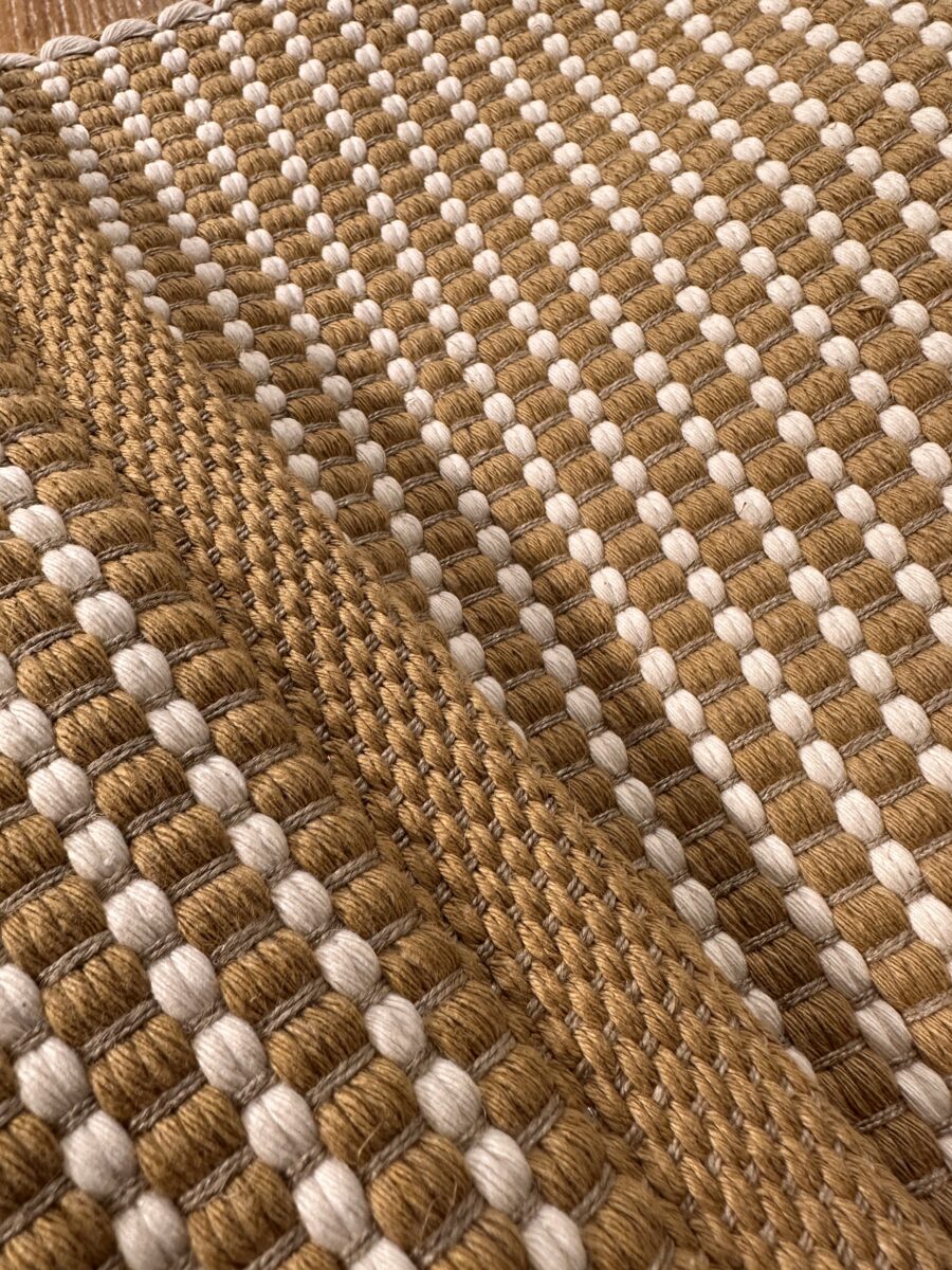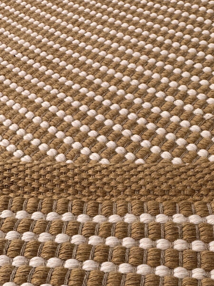 La scelta dei materiali è centrale. I tappeti sono composti esclusivamente da fibre naturali, selezionate per garantire qualità, durata e benessere negli ambienti domestici. Il cotone viene utilizzato per la trama, mentre il lino costituisce l’ordito. Questa combinazione dona al tappeto una struttura equilibrata, resistente ma allo stesso tempo piacevole al tatto. Inoltre, trattandosi di materiali naturali, il prodotto risulta anallergico ed ecologico, ideale anche per chi presta particolare attenzione alla salubrità della casa.