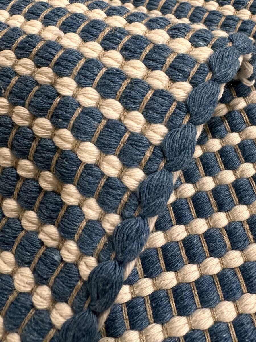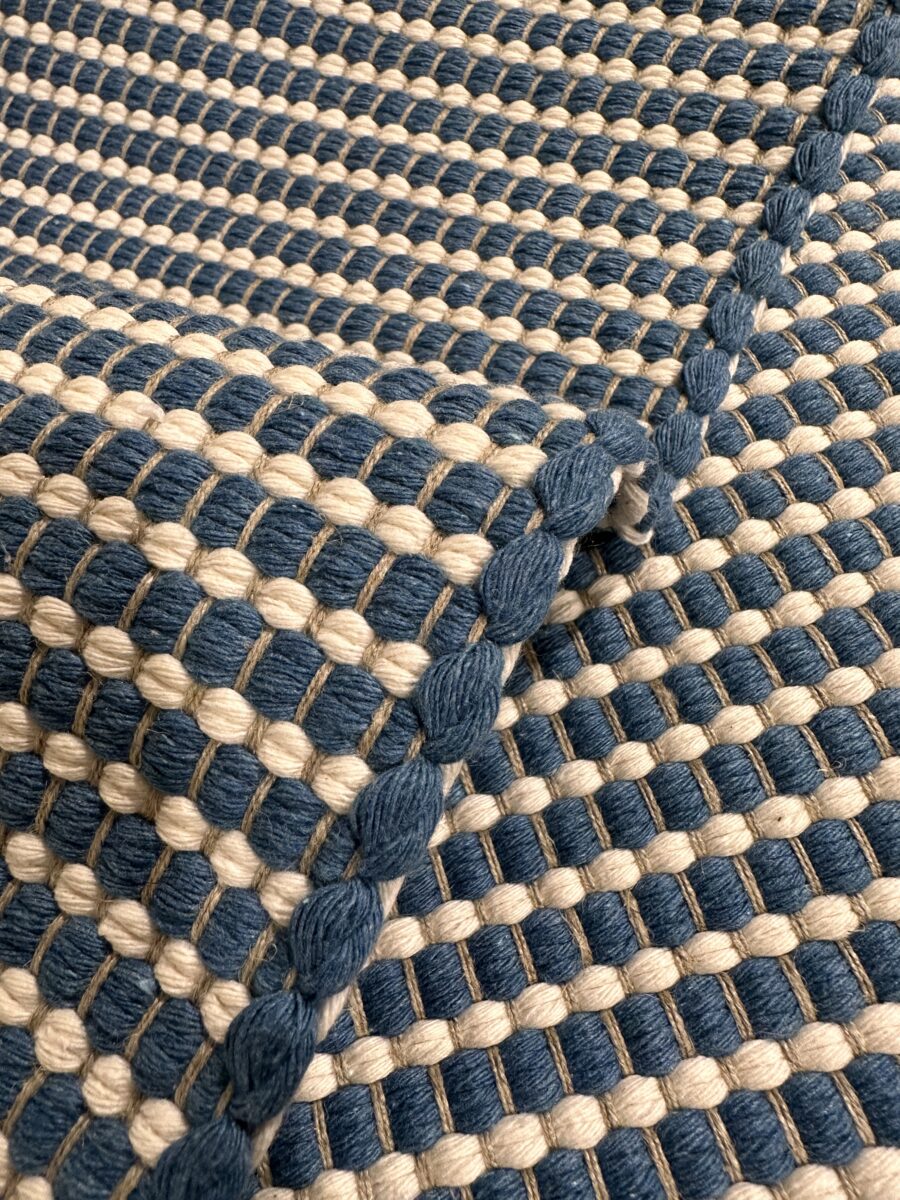 La larghezza del Tappeto Nodo Denim è determinata dal telaio ed è pari a 60 cm, una misura pensata per adattarsi con facilità a diversi spazi della casa. La lunghezza, invece, può variare su richiesta, arrivando fino a 3 metri. Questo permette di utilizzare il tappeto in corridoi, ingressi, cucine o ai piedi di un letto, adattandolo alle esigenze specifiche di ogni ambiente.