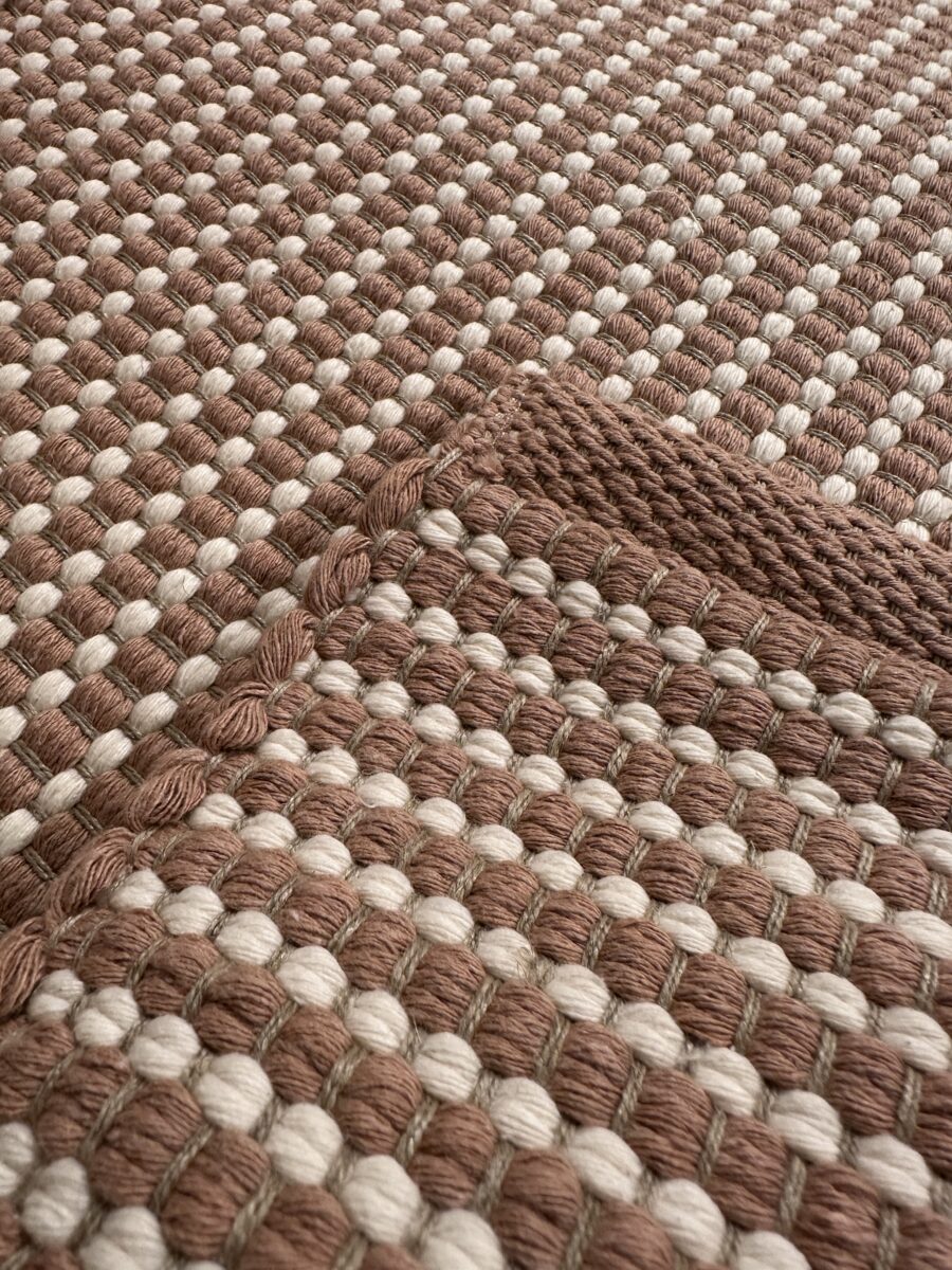 La scelta dei materiali è centrale. I tappeti sono composti esclusivamente da fibre naturali, selezionate per garantire qualità, durata e benessere negli ambienti domestici. Il cotone viene utilizzato per la trama, mentre il lino costituisce l’ordito. Questa combinazione dona al tappeto una struttura equilibrata, resistente ma allo stesso tempo piacevole al tatto. Inoltre, trattandosi di materiali naturali, il prodotto risulta anallergico ed ecologico, ideale anche per chi presta particolare attenzione alla salubrità della casa.