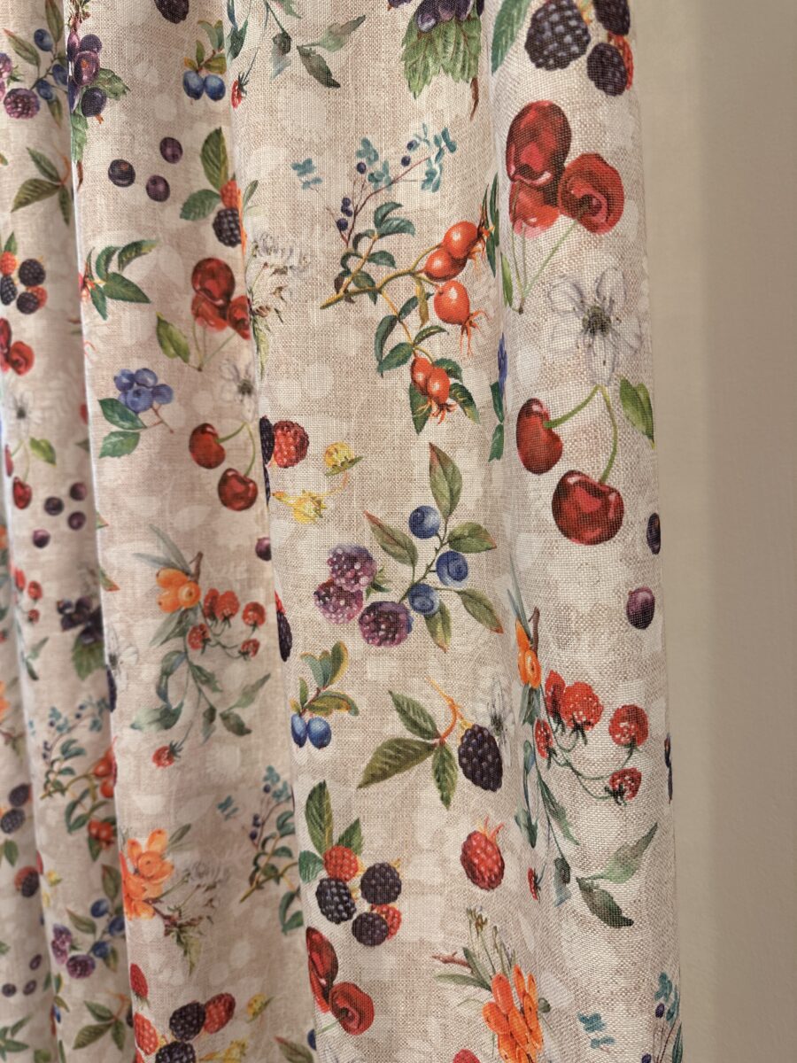 Le tende in voile di lino con stampa frutta si prestano inoltre ad essere abbinate a tendaggi più strutturati, permettendo di creare composizioni a più livelli che uniscono funzionalità ed estetica.