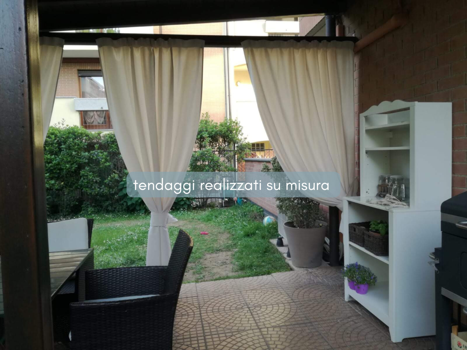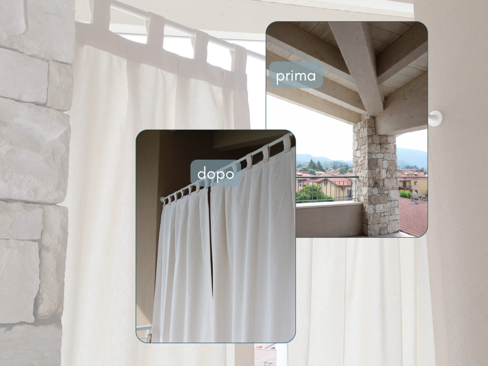 Le tende per portico su misura possono essere lasciate libere oppure raccolte lateralmente o al centro con embrasse, creando un effetto decorativo elegante e naturale.