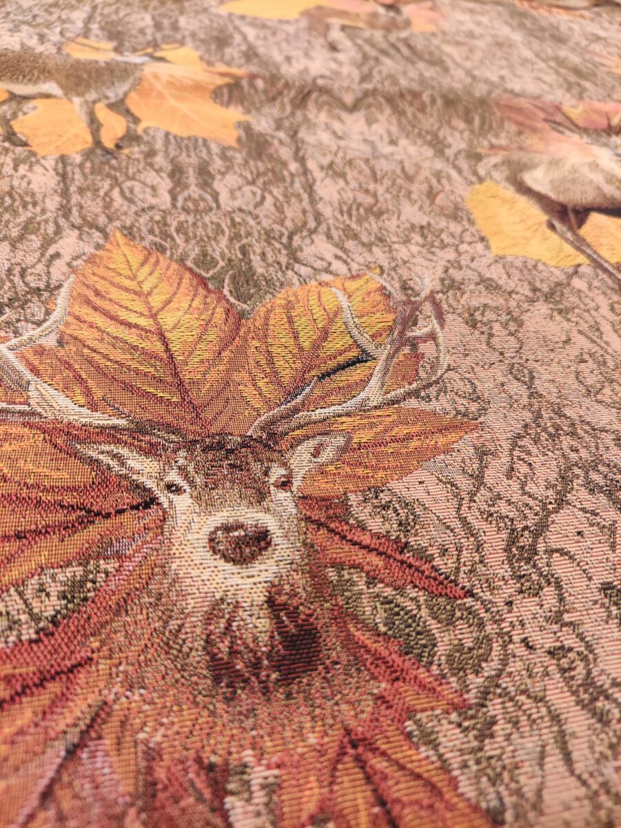 Tessuto Cervi e Foglie – Questo tessuto jacquard interpreta il tema della montagna in modo più decorativo e raffinato. Il disegno nasce dall’intreccio stesso dei filati e non da una semplice stampa. Questo conferisce al tessuto una profondità materica evidente, fatta di rilievi, chiaroscuri e texture che cambiano con la luce.