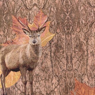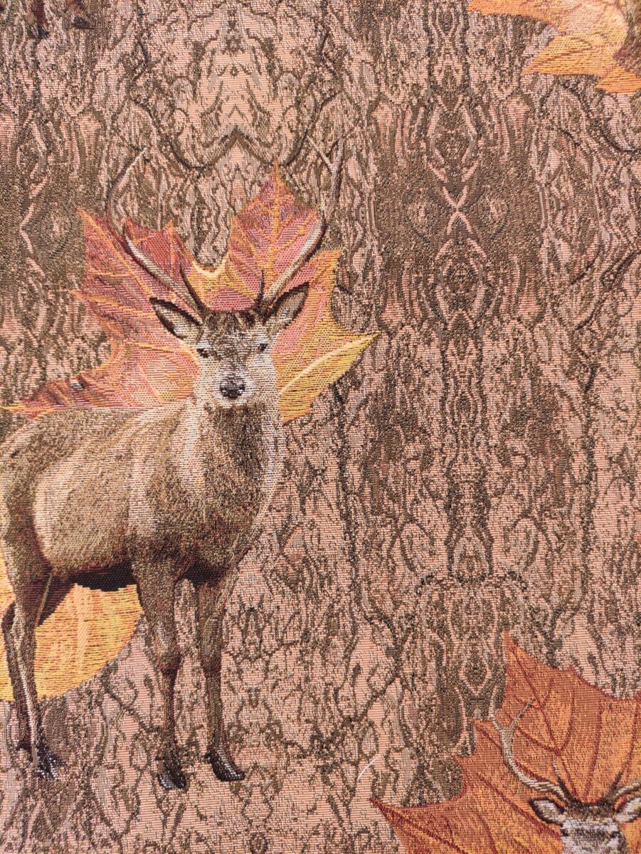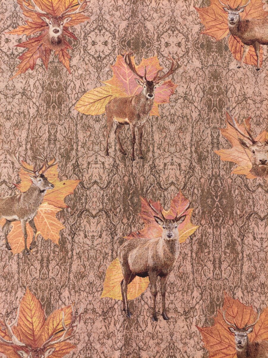 I cervi emergono tra foglie e elementi naturali, creando una composizione ricca ma armoniosa. I colori sono caldi e avvolgenti. Le tonalità autunnali, che spaziano dai marroni ai verdi, fino ai tocchi più dorati, rendono questo tessuto perfetto per ambienti accoglienti e ricercati. È una scelta ideale per chi ama lo stile montagna, ma desidera un risultato più elegante e strutturato.