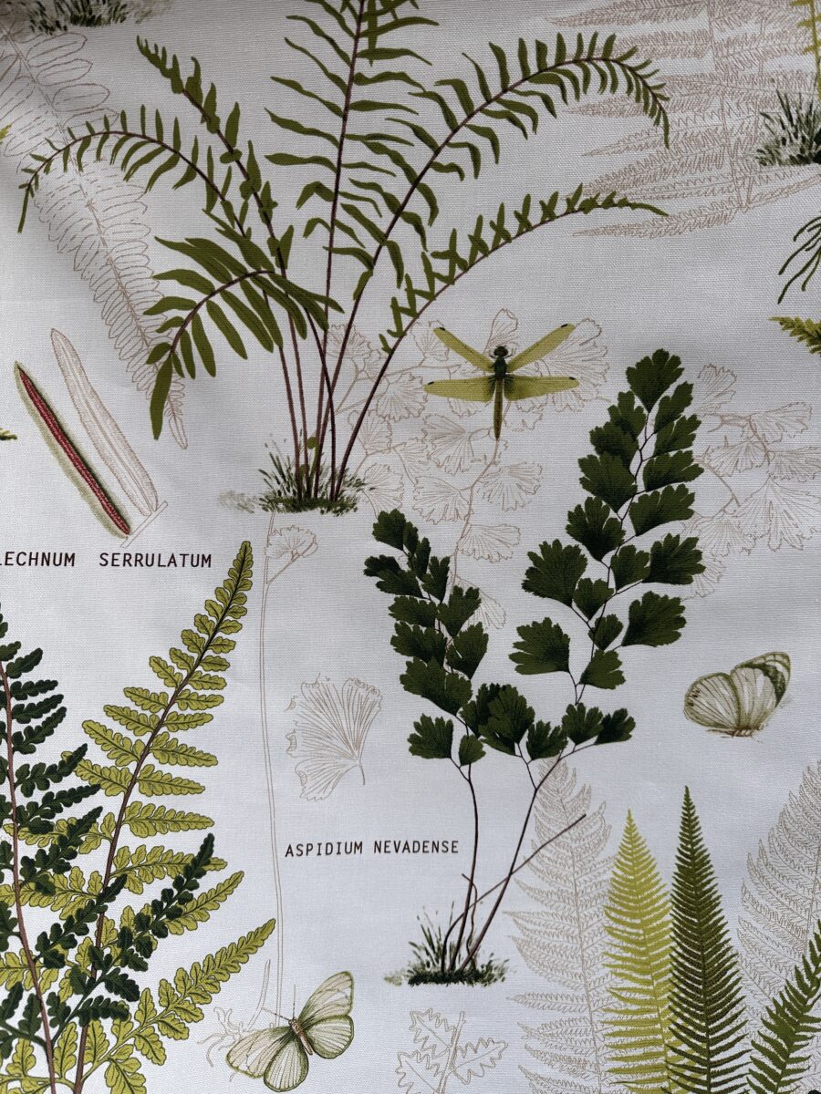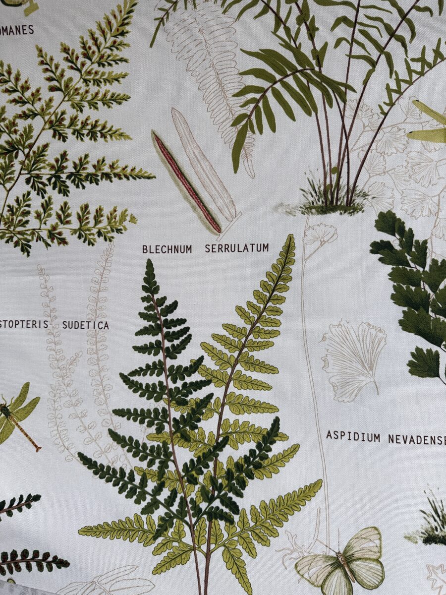 Il disegno ricorda le pagine di un erbario scientifico. Felci, foglie e piante si dispongono sul fondo chiaro come se fossero state appena raccolte e catalogate. Accanto alle illustrazioni compaiono nomi botanici e piccoli dettagli grafici. Questi elementi aggiungono autenticità e profondità alla composizione.