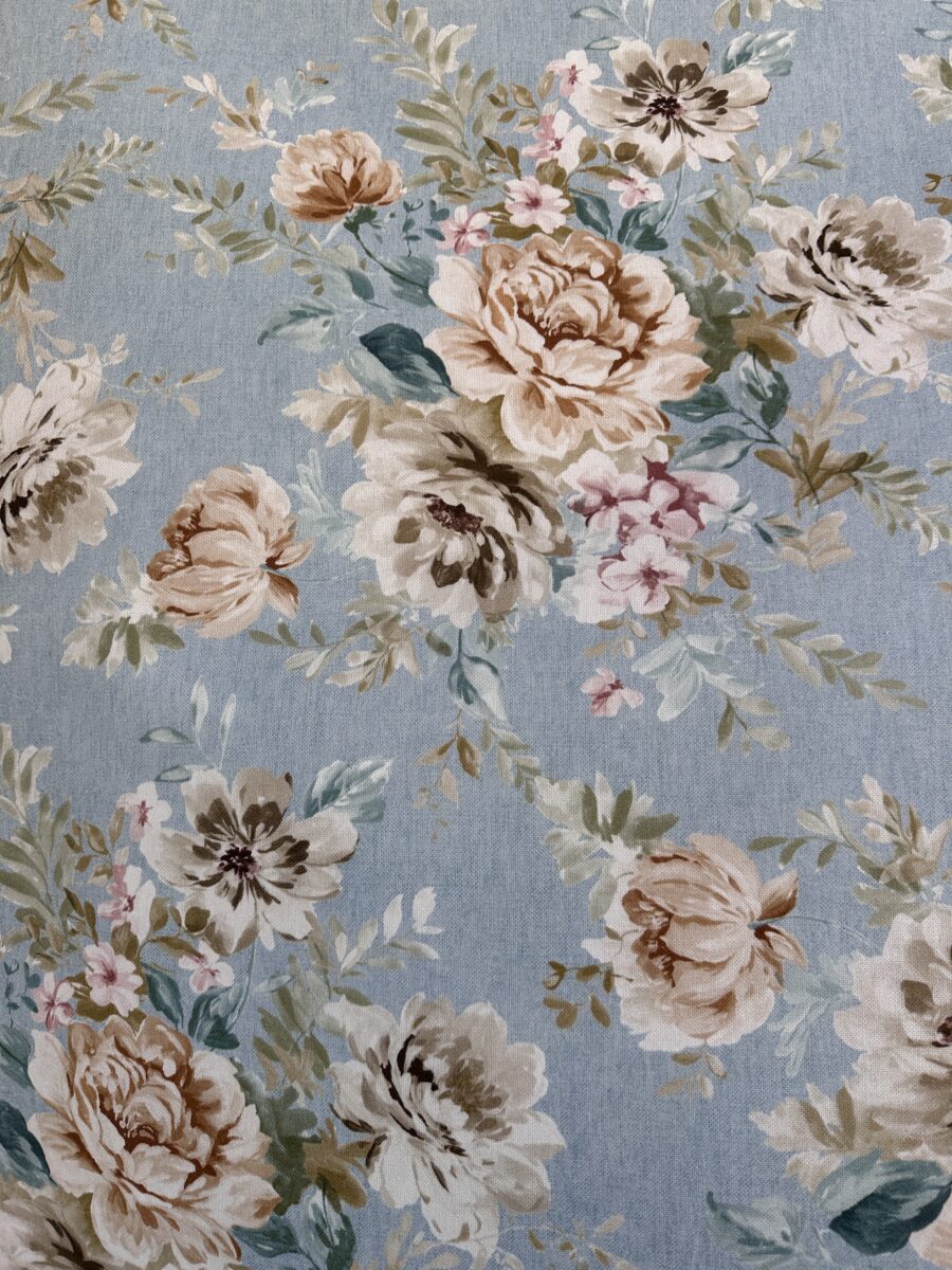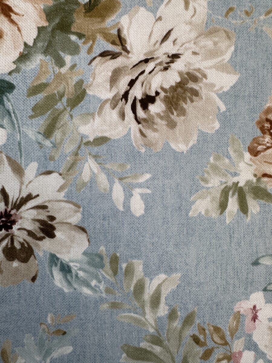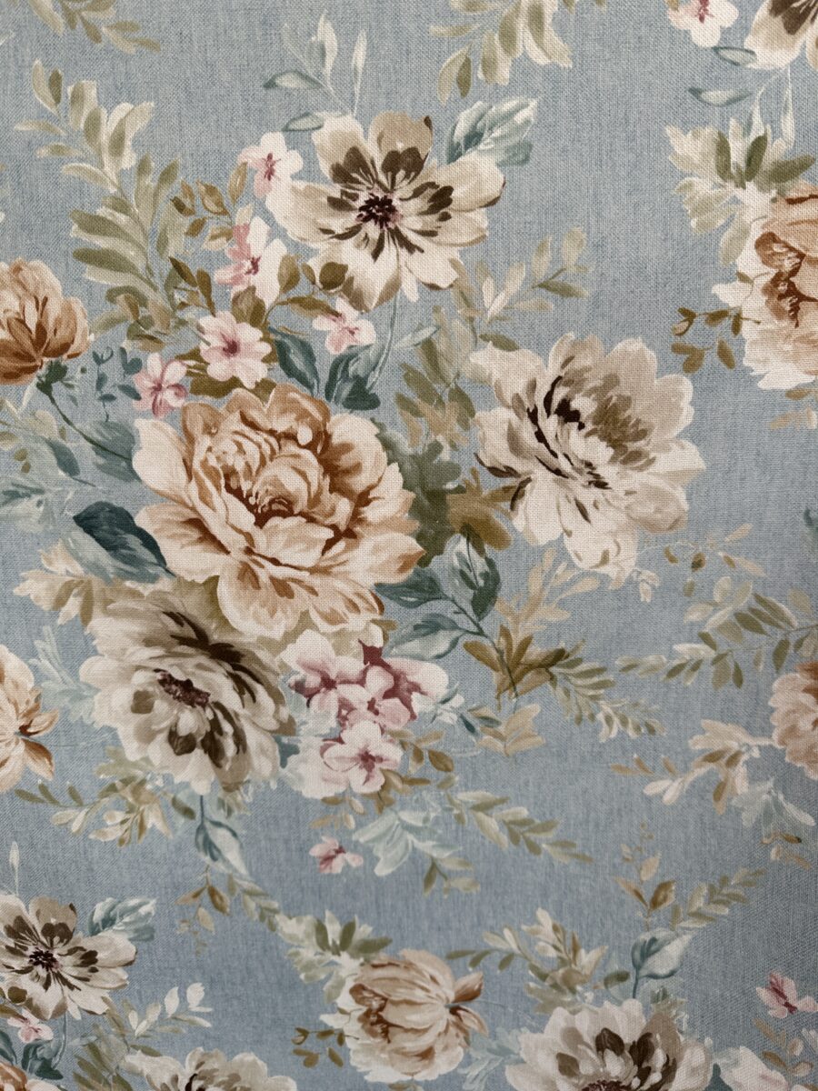 Il fondo azzurro polveroso crea una base rilassante e raffinata, sulla quale sbocciano fiori nei toni naturali del beige, crema e verde salvia, con piccoli accenti rosati. L’effetto complessivo è armonioso e leggero, ideale per ambienti accoglienti e curati nei dettagli.