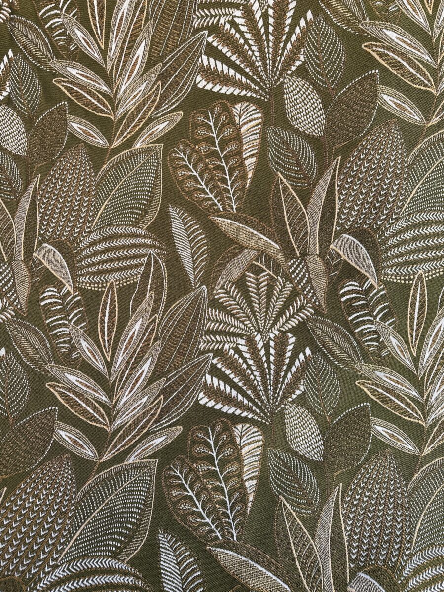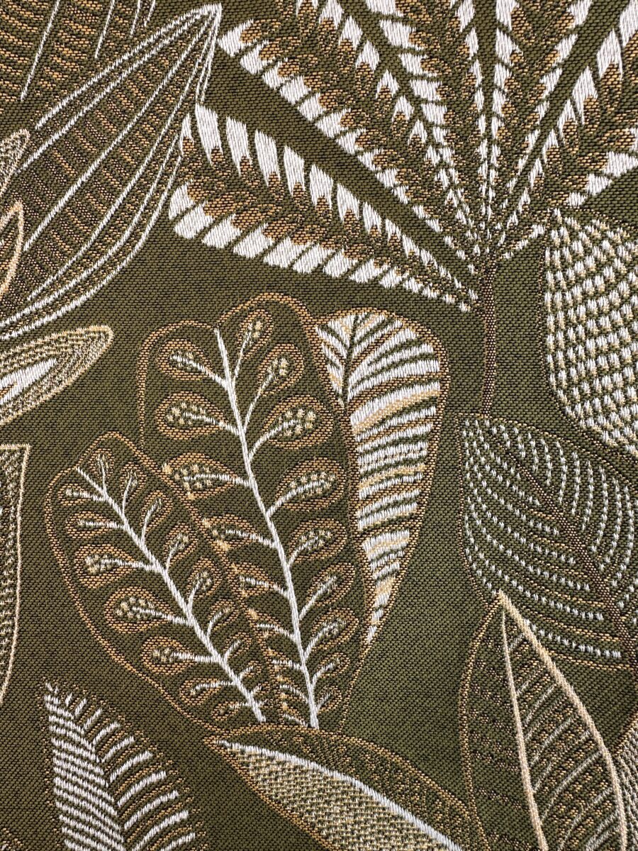 Il tessuto foglie ricamate kaki e oro è una proposta elegante e sofisticata, caratterizzata da un raffinato gioco di contrasti tra tonalità naturali e dettagli luminosi. Il motivo decorativo, ispirato alle forme della natura, richiama foglie stilizzate che sembrano ricamate sulla superficie del tessuto, creando un effetto ricco ma equilibrato.