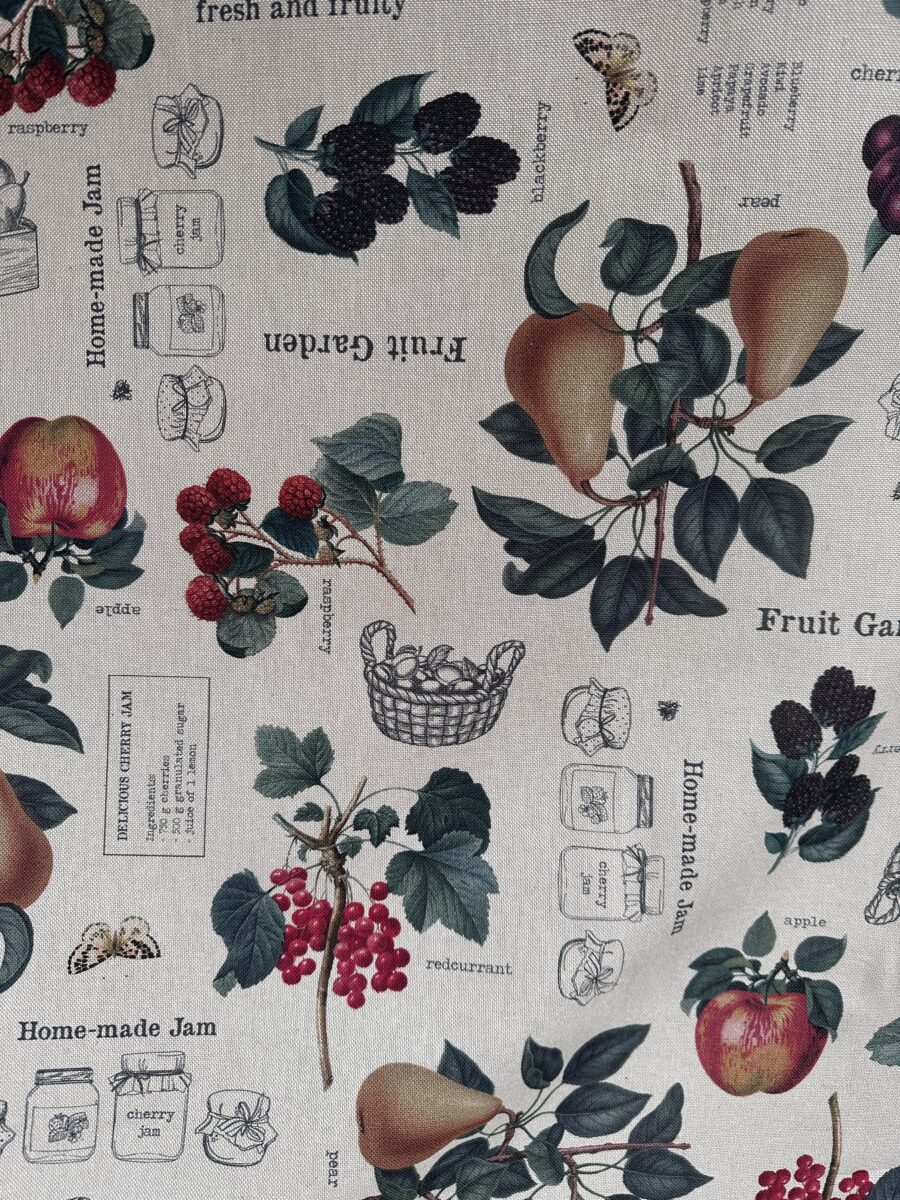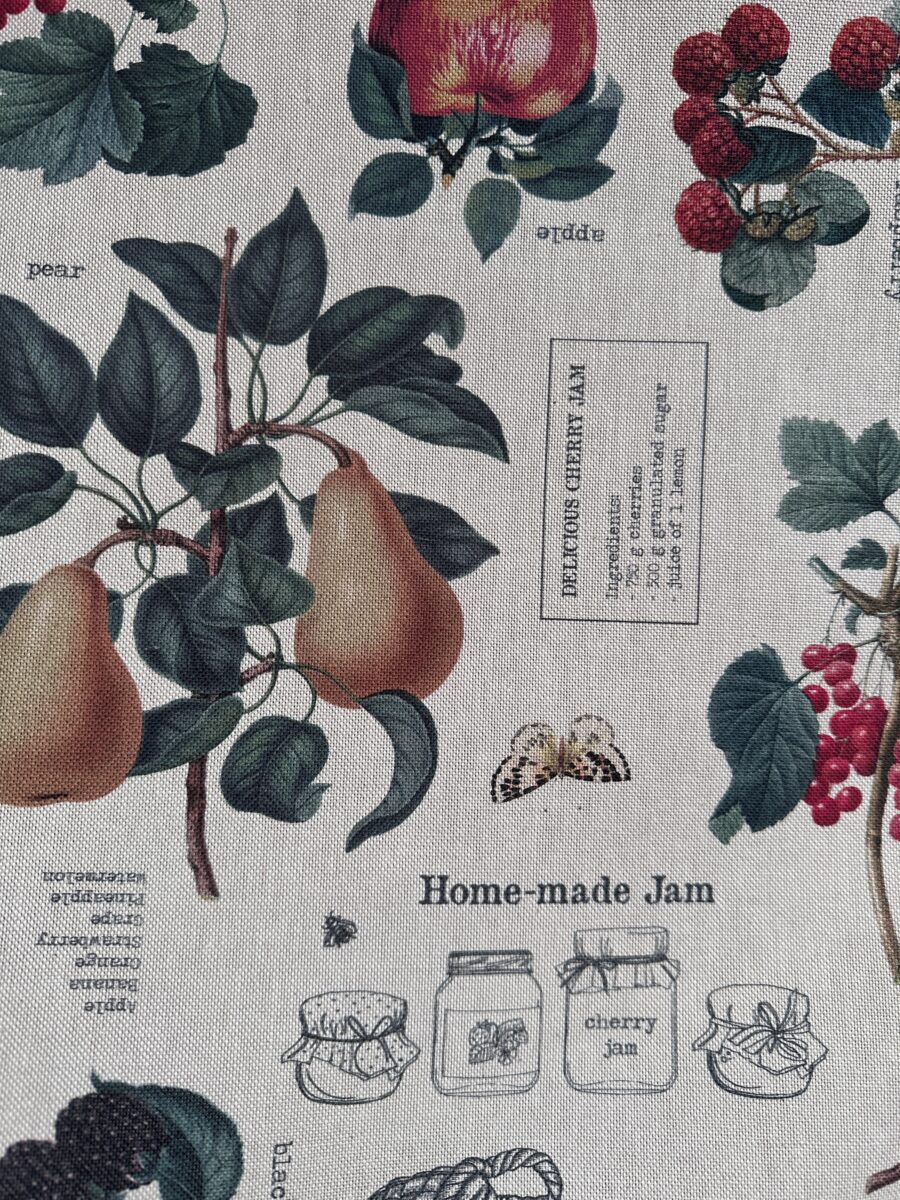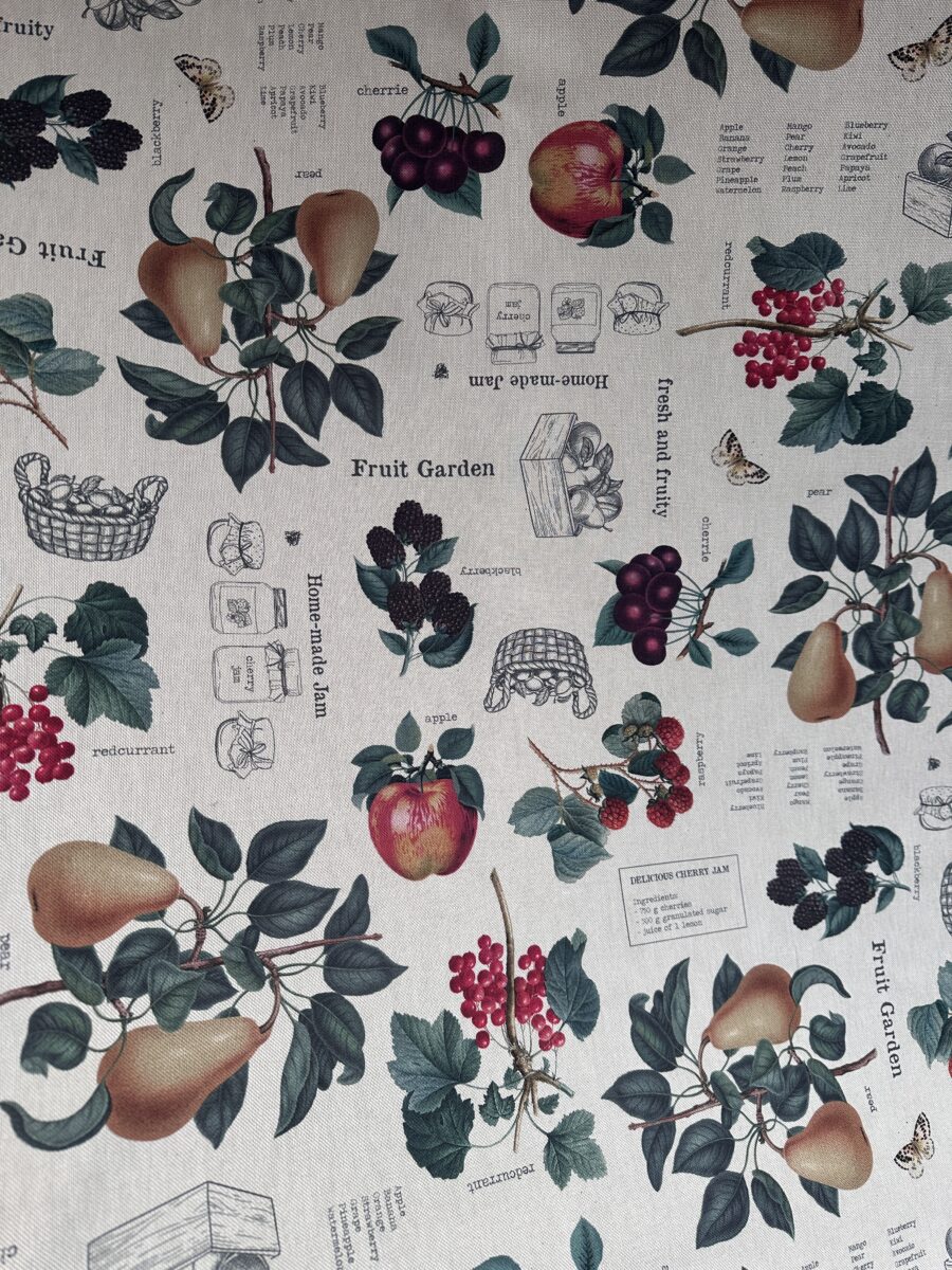 La fantasia mostra pere, mele, ciliegie, more e ribes. I frutti compaiono tra foglie dettagliate e piccoli rami eleganti. In mezzo al disegno si trovano anche cestini, vasetti e illustrazioni che ricordano le etichette delle marmellate artigianali. Alcune scritte decorative come Fruit Garden o Home-made jam aggiungono un tocco grafico originale. Il risultato è una composizione ricca ma armoniosa.