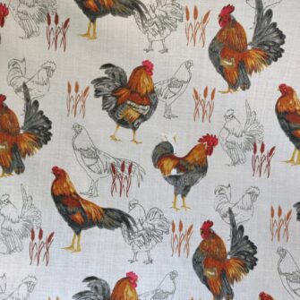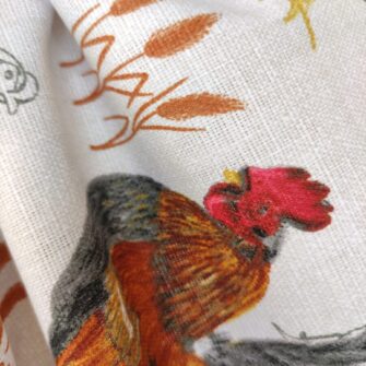 Tessuto Galli e Galline – Questo tessuto a tema galli e galline interpreta il mondo rurale con uno stile illustrato elegante e curato. Le figure, alternate tra versioni realistiche e tratti grafici più leggeri, creano un ritmo visivo vivace ma ben bilanciato. Il fondo chiaro valorizza i colori caldi del piumaggio, rendendo il disegno leggibile e armonioso.