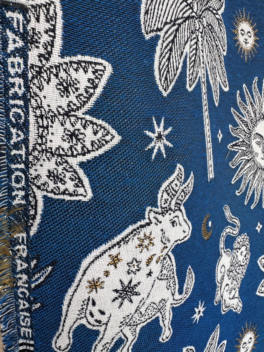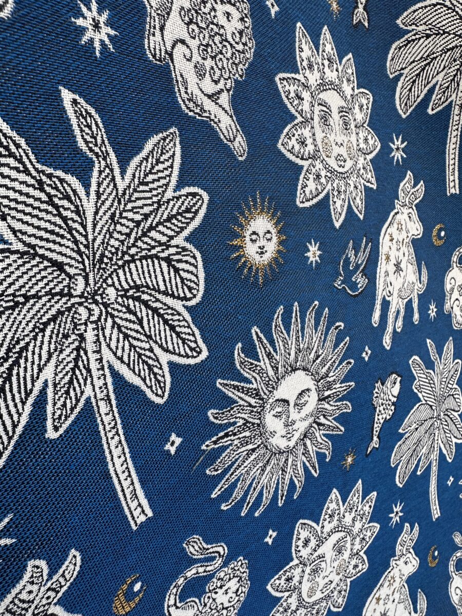 Il fondo blu profondo crea un contrasto elegante con i disegni chiari. Soli, stelle, animali simbolici e palme si distribuiscono nello spazio come in una mappa celeste immaginaria. Ogni elemento sembra sospeso, come se galleggiasse in un cielo notturno ricco di significati.