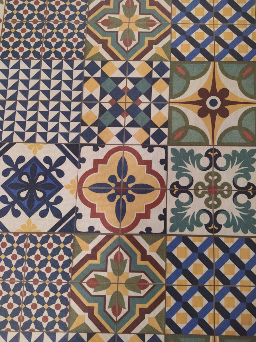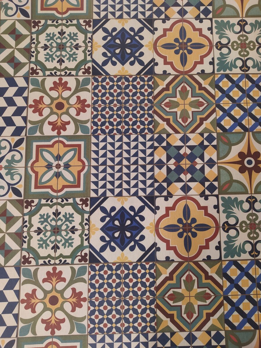 La fantasia è composta da un mosaico di mattonelle decorative. Ogni riquadro presenta un motivo diverso: geometrie, rosoni, intrecci e decorazioni floreali stilizzate. I colori sono caldi e armoniosi. Il blu intenso si alterna con il giallo, il verde e il rosso mattone, creando un equilibrio vivace ma elegante. L’insieme ricorda le maioliche artigianali che si trovano nelle città costiere e nei borghi del sud Italia.