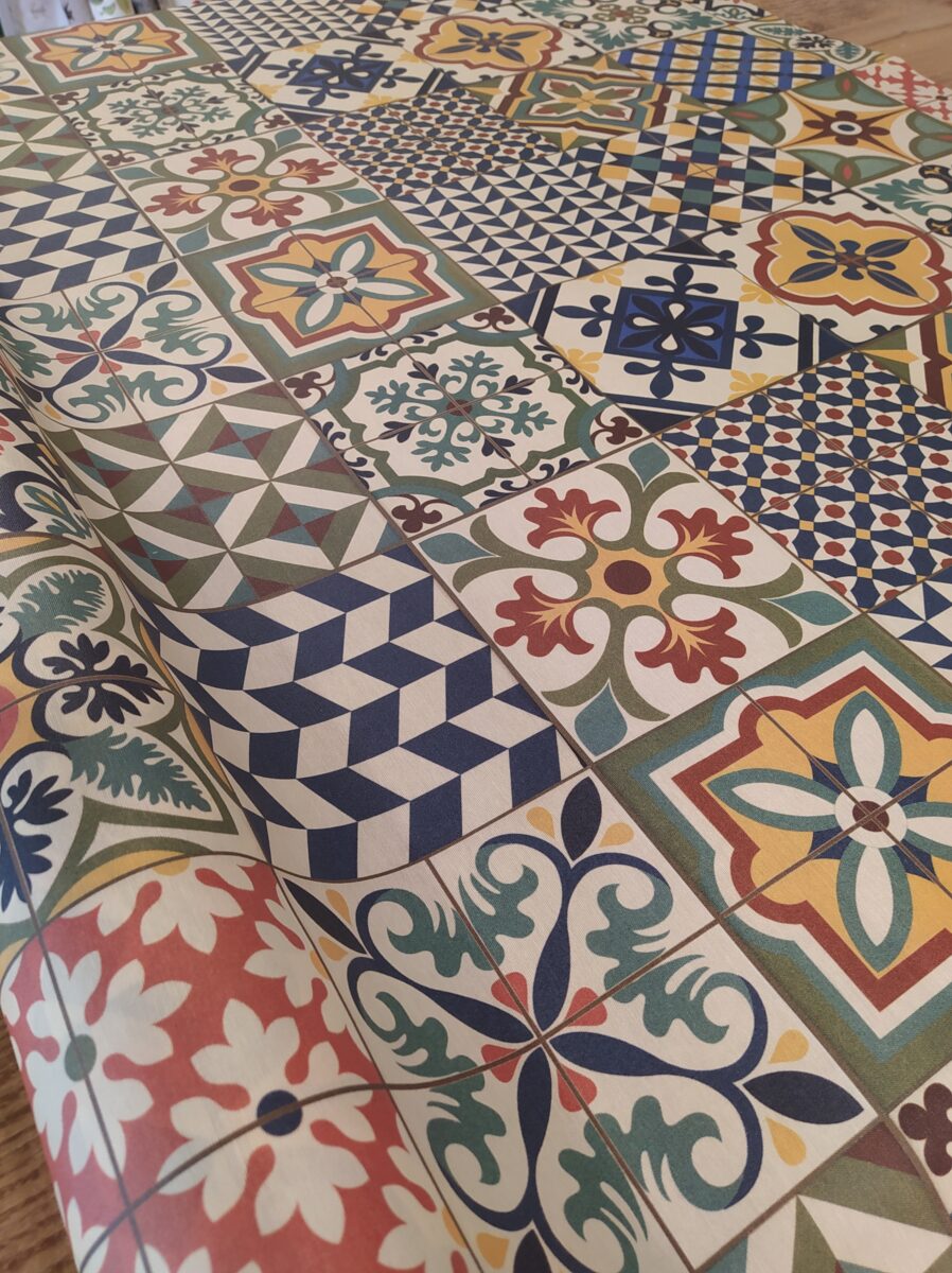 Il Tessuto Maioliche Antimacchia Resinato, In conclusione, unisce tradizione decorativa e praticità moderna. Una fantasia colorata che rende la tavola e la cucina più accoglienti e piene di carattere.