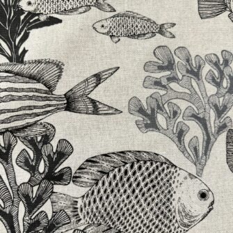 Il Tessuto Pesci Carboncino è una proposta dal carattere deciso e contemporaneo, pensata per chi ama il mondo marino reinterpretato in chiave grafica. Il disegno raffigura pesci e alghe stilizzate, realizzati con un tratto che ricorda l’illustrazione a carboncino. Il risultato è un effetto raffinato, quasi monocromatico, capace di arredare con personalità senza risultare invadente.