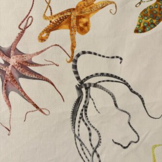 La stampa digitale raffigura polpi stilizzati, disposti con ritmo e leggerezza sulla superficie del tessuto. I colori, ispirati a una palette marina e tropicale, emergono con eleganza sul fondo chiaro del lino, valorizzando ogni dettaglio grafico. Le forme fluide dei tentacoli creano movimento e profondità, dando vita a una composizione dinamica e contemporanea. Il richiamo alle antiche stampe giapponesi gyotaku è evidente, soprattutto nella resa pittorica e nella delicatezza dei segni, che conferiscono al tessuto un carattere artistico e ricercato.