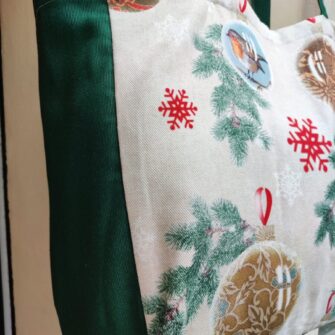 Tote Bag Decoration – Questa borsa in tessuto è pensata per accompagnarti durante le giornate invernali e natalizie con praticità e stile. Realizzata con cura nel nostro laboratorio di Brescia, nasce dalla scelta di un tessuto decorativo ricco di dettagli, dove rami di abete, sfere natalizie, fiocchi e piccoli elementi grafici si intrecciano su un fondo chiaro, creando un effetto elegante e luminoso. È una borsa che racconta l’atmosfera del Natale in modo raffinato, senza risultare eccessiva, perfetta per chi ama i dettagli curati e i prodotti unici.