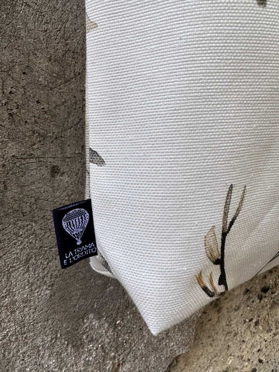 L’etichetta con il logo Trama e Ordito Tessuti certifica autenticità e produzione 100% italiana. Ogni borsa è unica, con piccole variazioni nella disposizione dei soggetti sul tessuto, che la rendono un pezzo irripetibile.