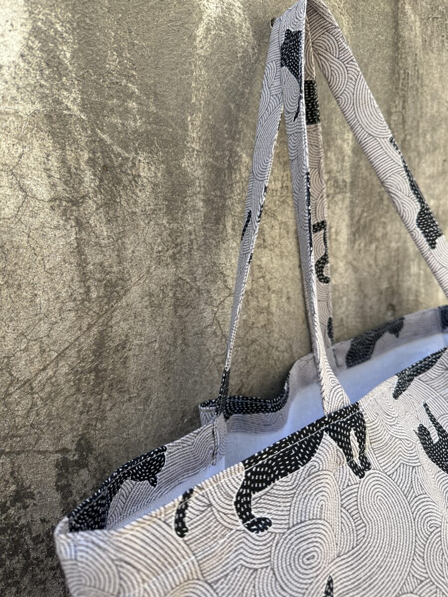 La tote bag in tessuto Gatti Silhouette è un accessorio elegante e raffinato, pensato per chi ama i gatti e desidera portare sempre con sé un dettaglio di stile. Non è solo una borsa capiente e funzionale, ma anche un modo per esprimere la propria personalità con una fantasia sobria e moderna, capace di adattarsi a qualsiasi look.