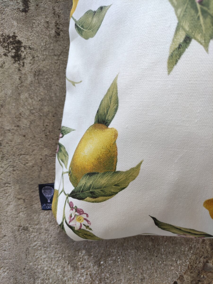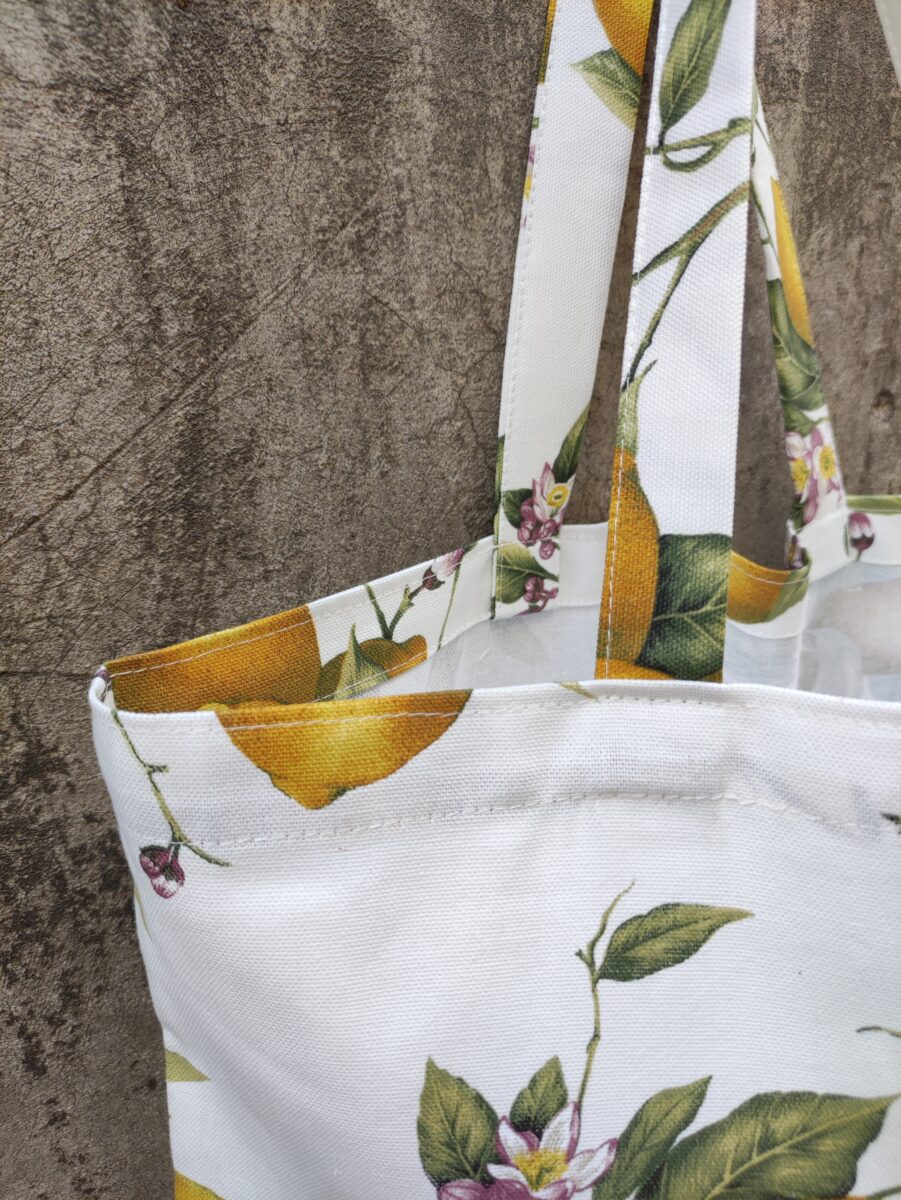 La Tote Bag in tessuto Limoni Positano porta con sé tutta la luce e l’allegria della Costiera Amalfitana. La fantasia, con limoni giallo vivo e foglie verdi su fondo chiaro, richiama il profumo degli agrumi e l’atmosfera solare del Mediterraneo. È un accessorio fresco, allegro e intramontabile, perfetto per chi ama vivere con leggerezza e colore.