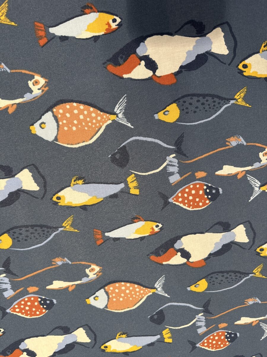 Il fondo blu profondo crea una base intensa e contemporanea. Su questa superficie si muovono pesci stilizzati dai colori vivaci. Arancio caldo, giallo luminoso, grigi morbidi e dettagli grafici punteggiati costruiscono ritmo e movimento. Il disegno richiama il mondo marino, ma con un tratto moderno e decorativo. Per questo il tessuto risulta dinamico e deciso.