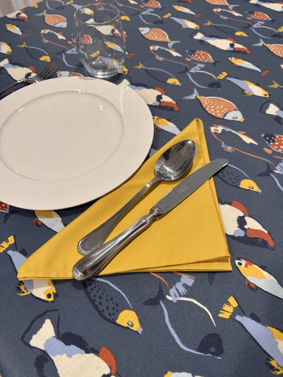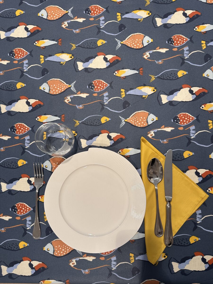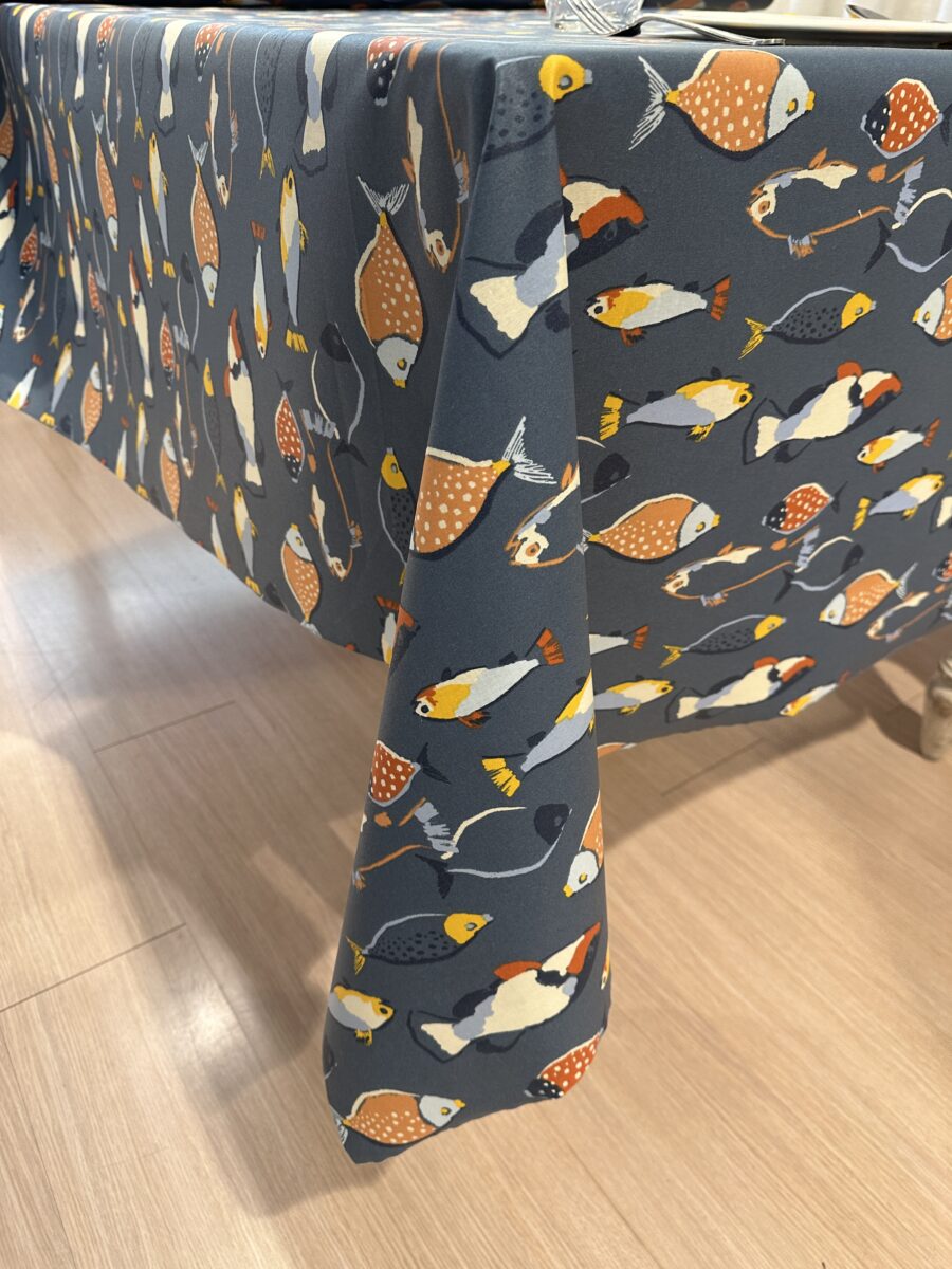 La Tovaglia Antimacchia Pesci Blu è tagliata a vivo, senza orlo. Una caratteristica che non compromette il tessuto in quanto non sfila, mantenendo un aspetto essenziale e moderno.