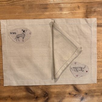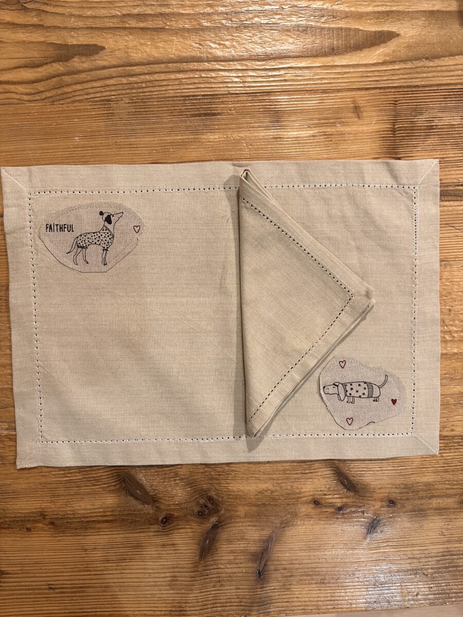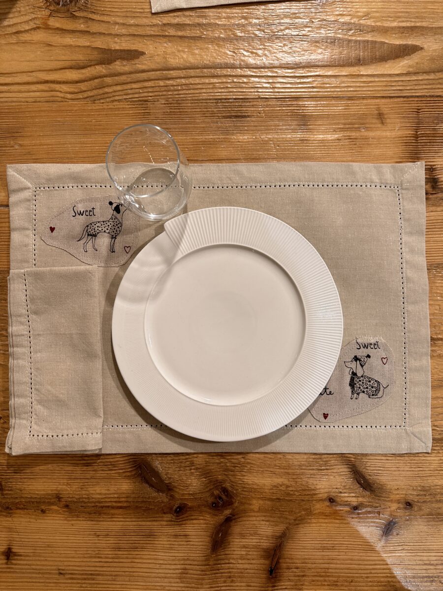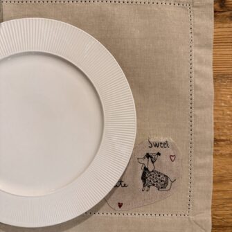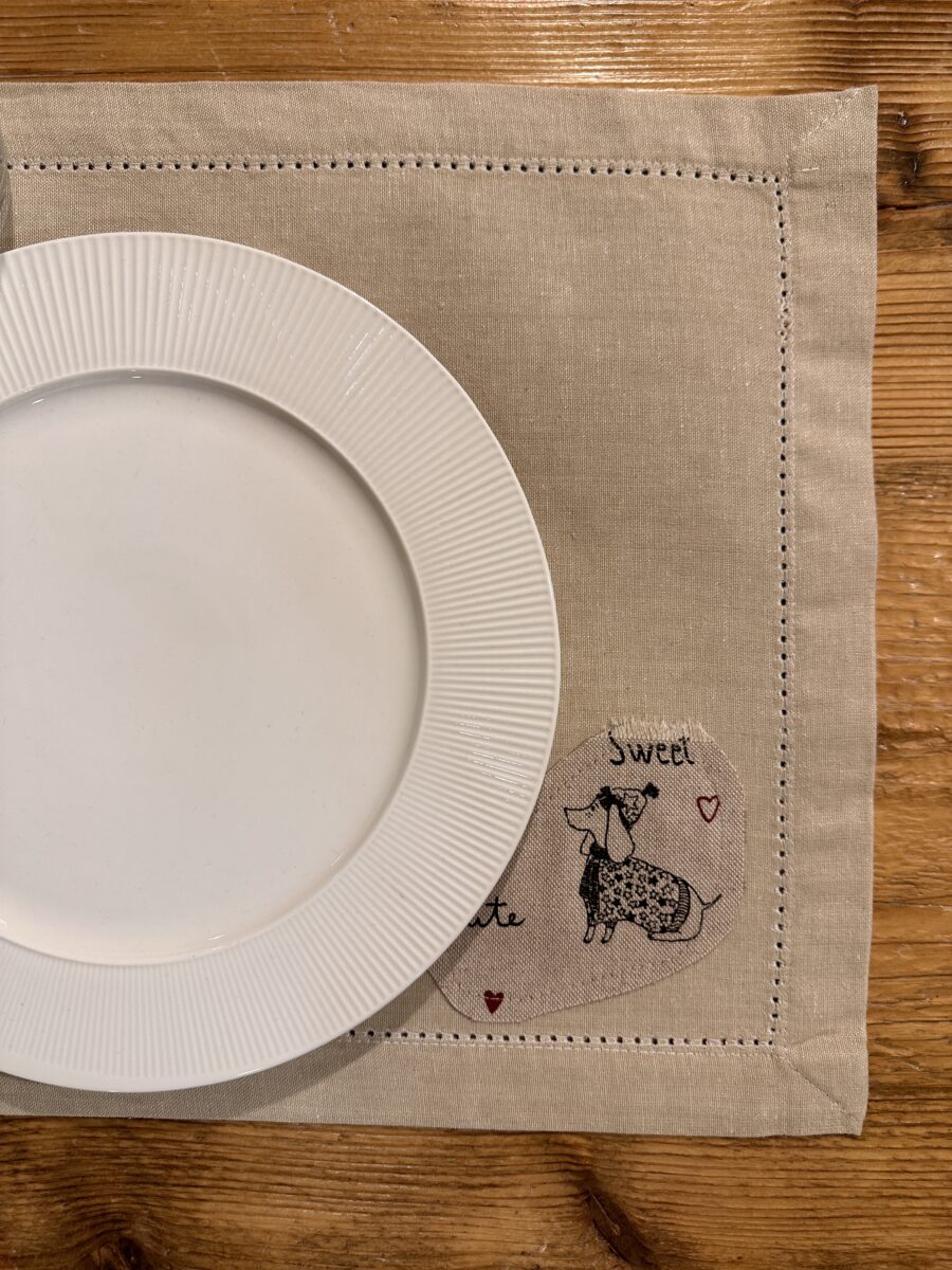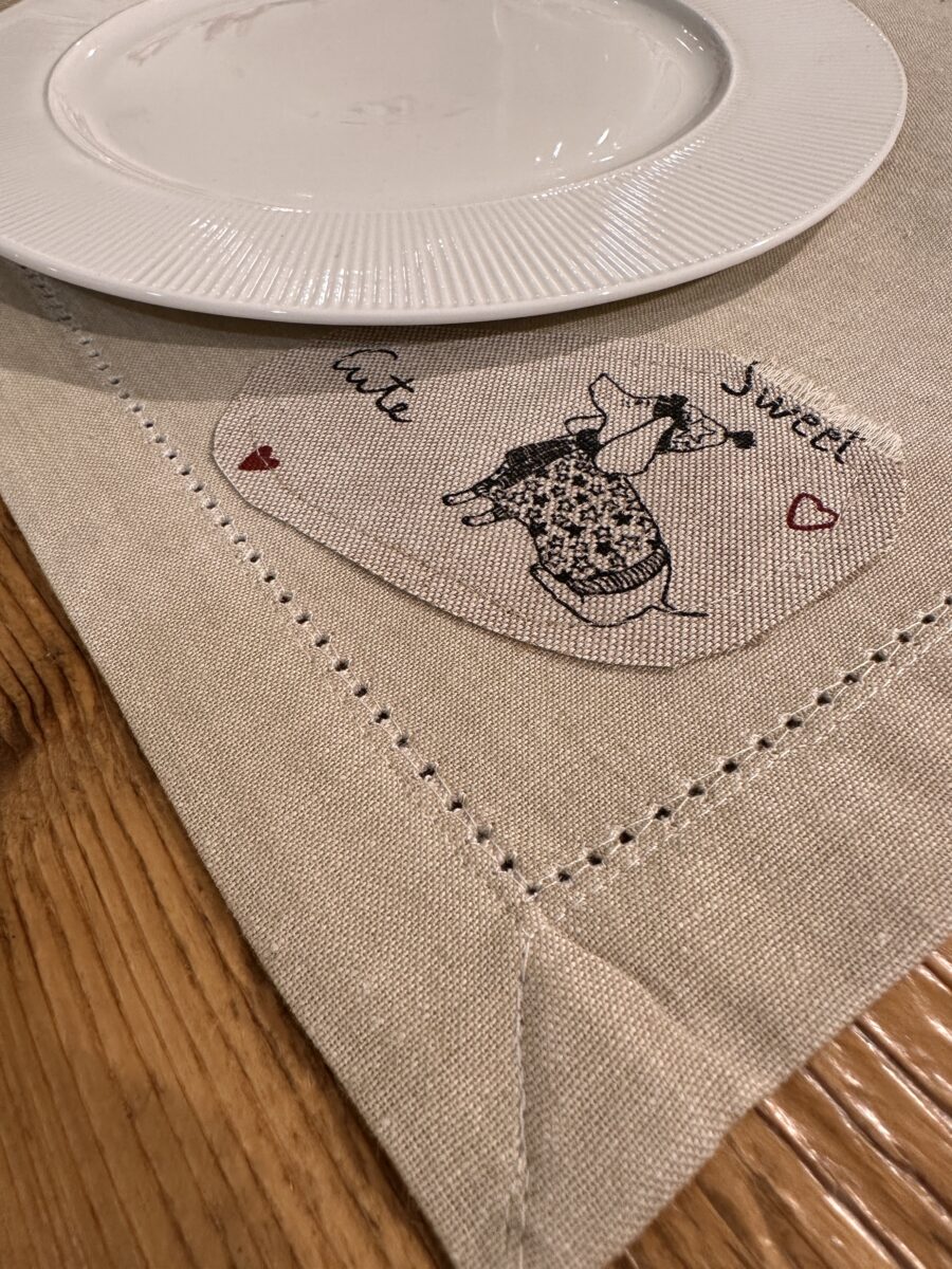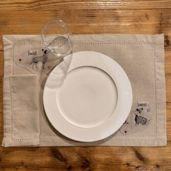 La Tovaglietta Americana Cani Love è venduta in abbinamento al suo tovagliolo, anch’esso rifinito con orlo a jour. Le stoviglie presenti nelle fotografie hanno il solo scopo illustrativo. L’etichetta con il nostro logo garantisce l’autenticità del manufatto e la qualità della lavorazione sartoriale. A causa della varietà dei soggetti presenti nei tessuti stampati, possono verificarsi lievi differenze nella posizione del motivo da una tovaglietta all’altra, rendendo ogni pezzo unico.