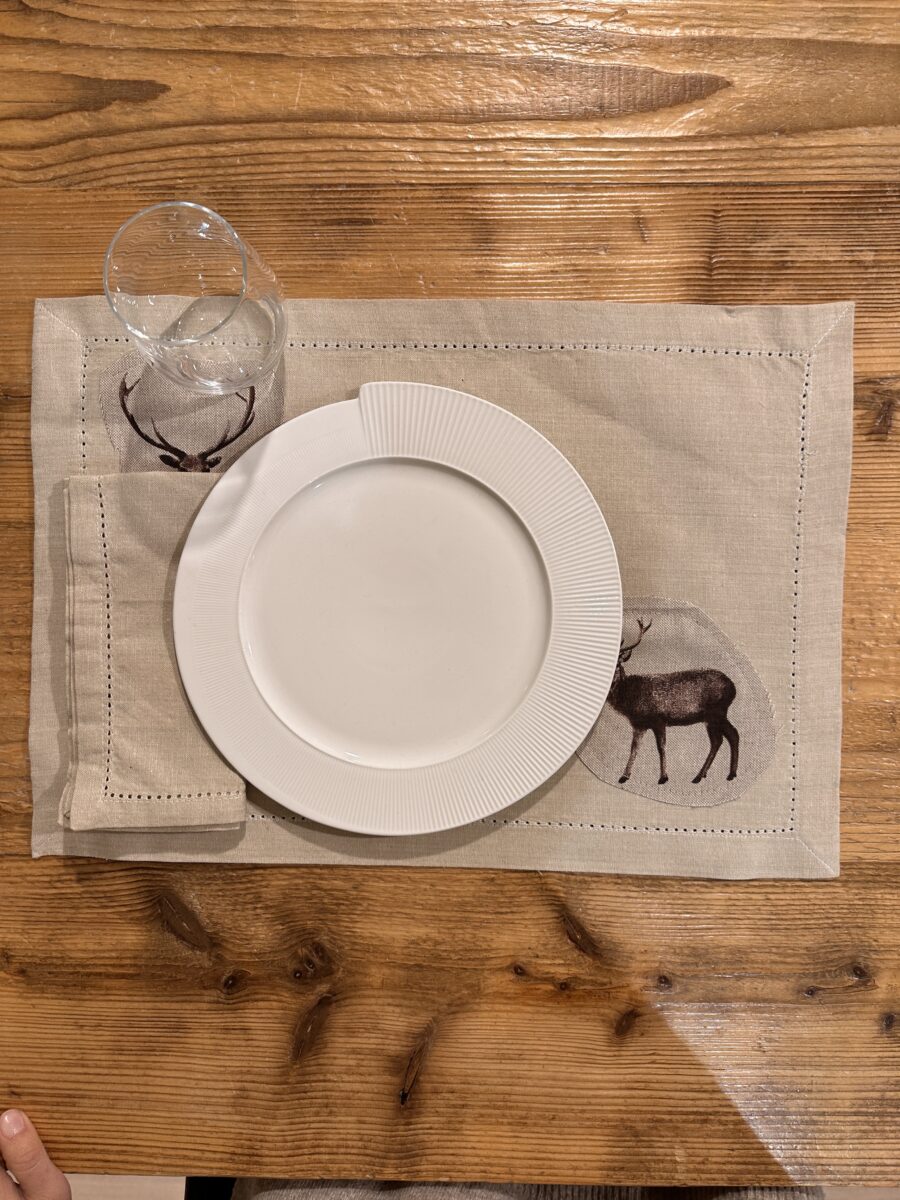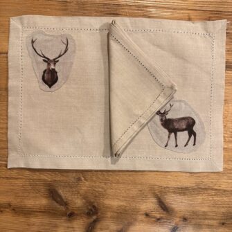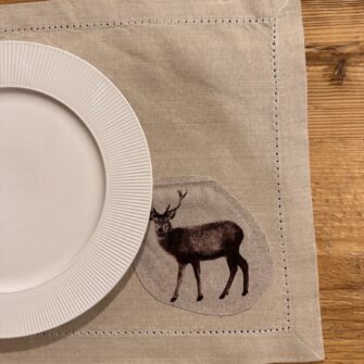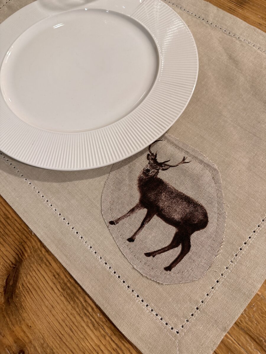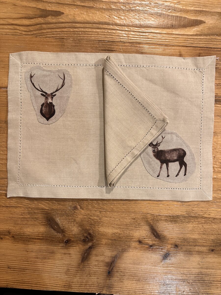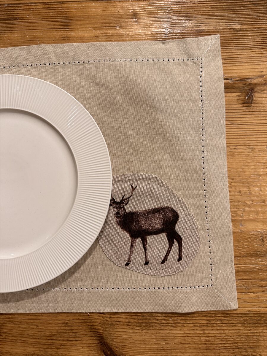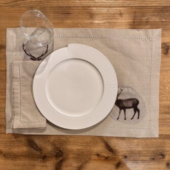 La Tovaglietta Americana Cervi Brown è venduta in abbinamento al suo tovagliolo, anch’esso rifinito con orlo a jour. Le stoviglie presenti nelle fotografie hanno il solo scopo illustrativo. L’etichetta con il nostro logo garantisce l’autenticità del manufatto e la qualità della lavorazione sartoriale. A causa della varietà dei soggetti presenti nei tessuti stampati, possono verificarsi lievi differenze nella posizione del motivo da una tovaglietta all’altra, rendendo ogni pezzo unico.