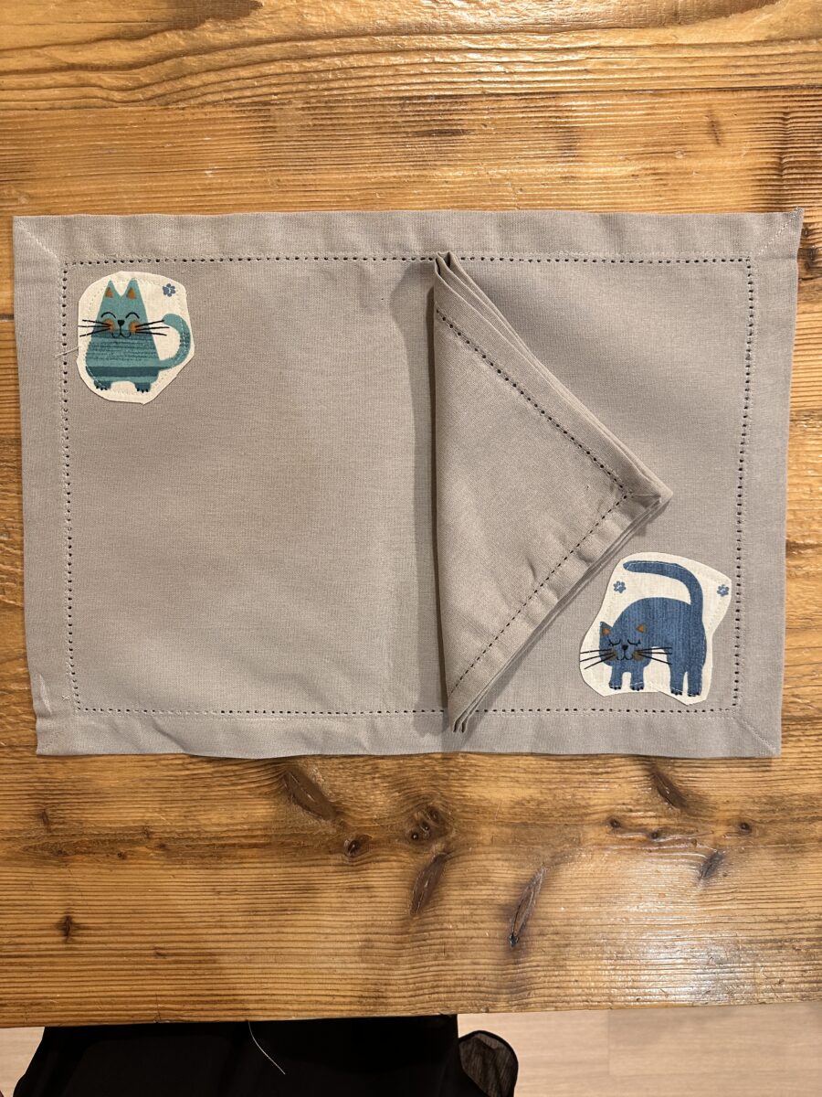 La Tovaglietta Americana Gatti Azzurri nasce per portare praticità ed eleganza sulla tua tavola quotidiana. Ogni pezzo è realizzato in cotone di alta qualità, in tinta unita, e rifinito con un accurato orlo a giorno che ne esalta il carattere sartoriale. La decorazione, realizzata con i tessuti esclusivi delle nostre collezioni, aggiunge un tocco di stile e permette di creare coordinati armoniosi con altri accessori per la cucina.