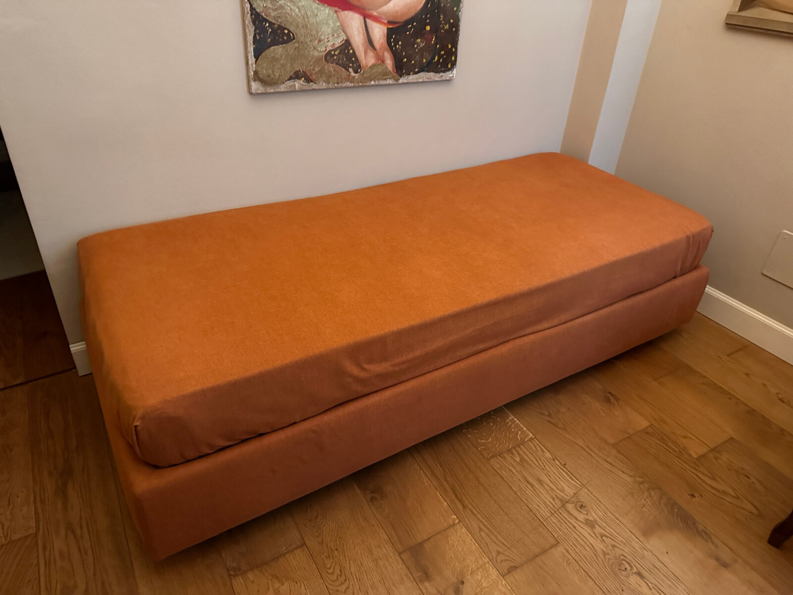 Questa trasformazione lettino in divanetto imbottito su misura non è un articolo in pronta consegna, ma è un esempio concreto di ciò che possiamo realizzare su misura. Studiamo ogni trasformazione partendo dalle dimensioni reali del letto, dall’uso previsto e dallo stile dell’ambiente in cui verrà inserito.