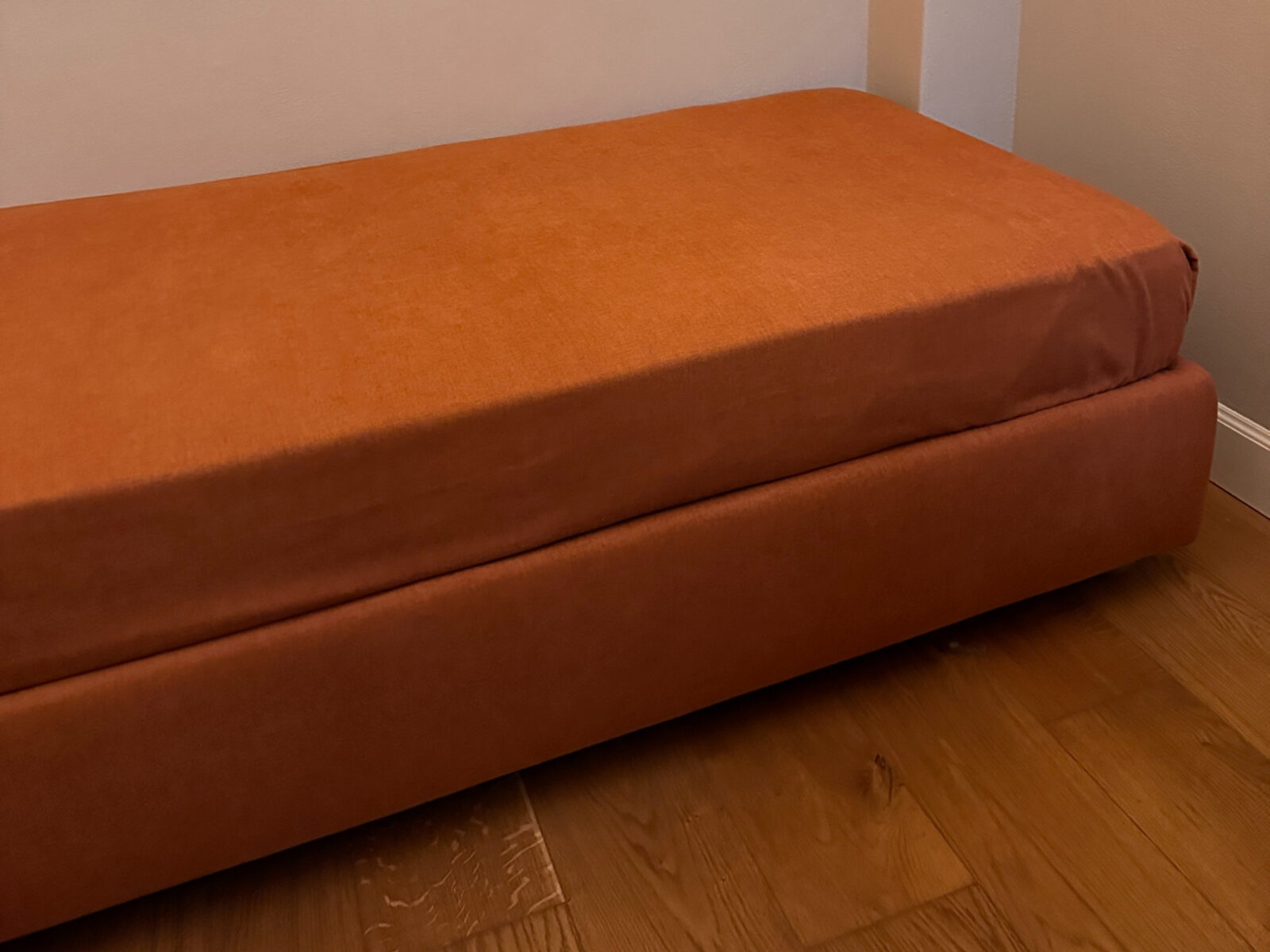 Il rivestimento tessile, realizzato su misura, segue con precisione le forme della struttura. Le linee risultano pulite, compatte e ben definite. Il colore caldo del tessuto contribuisce a rendere il divanetto visivamente protagonista, pur mantenendo un equilibrio con il resto dell’ambiente.
