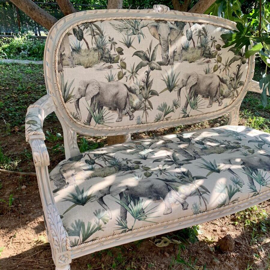 divanetto rivestito con tessuto Elefanti – La Trama e l’ordito –